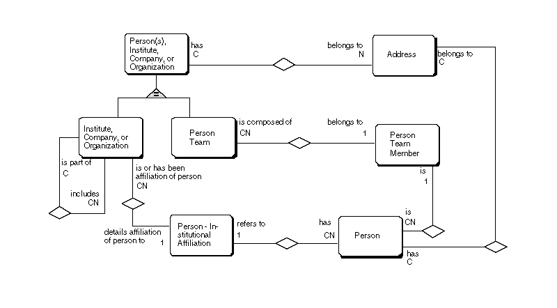 Figure 1 shows the resulting entity relationship model. The entity types PICO and Person Team form the most important linkage points to other entities in the CDEFD and IOPI models. For example, unit ownership, transfer, and location involves PICOs, while authorship, collecting, and taxon identification refers to Person Teams. Institutes, Companies or Organizations are frequently part of hierarchy (e.g.: an Institute is part of University). This is expressed by means of a reflexive structure. If required, the curriculum of a person as to the affiliation to institutes etc. can be recorded (Person Institutional Affiliation).