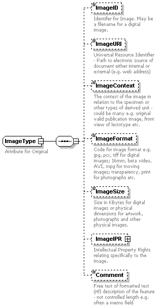 | source | <xs:element name="PreviousUnit" minOccurs="0" maxOccurs="unbounded"> <xs:annotation> <xs:documentation>A container for past ID and location of this specimen.</xs:documentation> <xs:appinfo> <sea:FullName> </sea:FullName> <sea:Audience>BioCASE</sea:Audience> <sea:Audience>CODATA TDWG</sea:Audience> <sea:Reviewer> </sea:Reviewer> <sea:ExistingStandards> </sea:ExistingStandards> <sea:Content>History of specimen</sea:Content> <sea:Examples>Changes of ownership and transfers between collections by sale, splitting or merging of collections</sea:Examples> <sea:Comments> </sea:Comments> <sea:Rules> </sea:Rules> <sea:EditorialNotes> </sea:EditorialNotes> </xs:appinfo> </xs:annotation> <xs:complexType> <xs:sequence> <xs:element name="PreviousUnitID" type="OpenIDType" minOccurs="0"> <xs:annotation> <xs:documentation>Identifier of specimen in previous collection.</xs:documentation> <xs:appinfo> <sea:FullName> </sea:FullName> <sea:Audience>BioCASE</sea:Audience> <sea:Audience>CODATA TDWG</sea:Audience> <sea:Reviewer> </sea:Reviewer> <sea:ExistingStandards>BioCISE Model: Unit_ID. </sea:ExistingStandards> <sea:ExistingStandards>ITF-2: Donor's Accession Identifier (=donac). </sea:ExistingStandards> <sea:ExistingStandards>NBN: Sample_KeyUnit key or Identifying number - can be multiple. </sea:ExistingStandards> <sea:ExistingStandards>Darwin Core 2: Previous Catalog Number. </sea:ExistingStandards> <sea:Content>Identifier of specimen in previous collection.</sea:Content> <sea:Examples> </sea:Examples> <sea:Comments> </sea:Comments> <sea:Rules> </sea:Rules> <sea:EditorialNotes> </sea:EditorialNotes> </xs:appinfo> </xs:annotation> </xs:element> <xs:element name="PreviousCollectionName" type="xs:string" minOccurs="0"> <xs:annotation> <xs:documentation>Name of collection previously holding this specimen.</xs:documentation> <xs:appinfo> <sea:FullName> </sea:FullName> <sea:Audience>BioCASE</sea:Audience> <sea:Audience>CODATA TDWG</sea:Audience> <sea:Reviewer> </sea:Reviewer> <sea:ExistingStandards> </sea:ExistingStandards> <sea:Content>Name of collection previously holding this specimen.</sea:Content> <sea:Examples> </sea:Examples> <sea:Comments> </sea:Comments> <sea:Rules> </sea:Rules> <sea:EditorialNotes> </sea:EditorialNotes> </xs:appinfo> </xs:annotation> </xs:element> <xs:element name="Date" type="DateTimeType" minOccurs="0"> <xs:annotation> <xs:documentation>Dates that the specimen was held in previous collection.</xs:documentation> <xs:appinfo> <sea:FullName> </sea:FullName> <sea:Audience>BioCASE</sea:Audience> <sea:Audience>CODATA TDWG</sea:Audience> <sea:Reviewer> </sea:Reviewer> <sea:ExistingStandards>NBN: vaguedatestart, vaguedateend and vaguedatetype. </sea:ExistingStandards> <sea:Content>Dates that the specimen was held in previous collection.</sea:Content> <sea:Examples> </sea:Examples> <sea:Comments> </sea:Comments> <sea:Rules> </sea:Rules> <sea:EditorialNotes> </sea:EditorialNotes> </xs:appinfo> </xs:annotation> </xs:element> <xs:element name="Comment" minOccurs="0"> <xs:annotation> <xs:documentation>Any further information about this specimen in its previous collection.</xs:documentation> <xs:appinfo> <sea:FullName> </sea:FullName> <sea:Audience>BioCASE</sea:Audience> <sea:Audience>CODATA TDWG</sea:Audience> <sea:Reviewer> </sea:Reviewer> <sea:ExistingStandards> </sea:ExistingStandards> <sea:Content>Any further information about this specimen in its previous collection.</sea:Content> <sea:Examples> </sea:Examples> <sea:Comments> </sea:Comments> <sea:Rules> </sea:Rules> <sea:EditorialNotes> </sea:EditorialNotes> </xs:appinfo> </xs:annotation> <xs:complexType> <xs:simpleContent> <xs:extension base="xs:string"> <xs:attribute name="Language" type="xs:language"/> </xs:extension> </xs:simpleContent> </xs:complexType> </xs:element> </xs:sequence> </xs:complexType> </xs:element> |