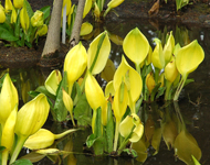 Zahlreiche Frühblüher zaubern einen Blütenteppich in die Wälder Nordamerikas, wie die Virginische Mertensie und die Dreizipfellilien. Im Sumpf- und Zypressenwald Nordamerikas ist der große gelbe Blütenstand des im Wasser wachsenden und stinkenden Amerikanischen Riesenaronstabes spektakulär. |