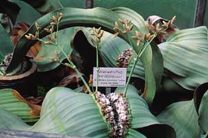 | Flowering male Welwitschia mirabilis subsp. mirabilis (plant nr. 2) in August 2000. | Flowering male Welwitschia mirabilis subsp. namibiana (plant nr. 6) in August 2000. |