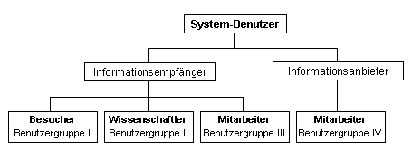 Auf der Grundlage der Ergebnisse der Systemanalyse in der Studienarbeit (/Hildebrandt96/) ist es sinnvoll, zur Strukturierung und Aufteilung des Gesamtsystems eine Unterscheidung verschiedener Benutzergruppen vorzunehmen, wie sie auch in Abschnitt 2.1 gefordert wurde.