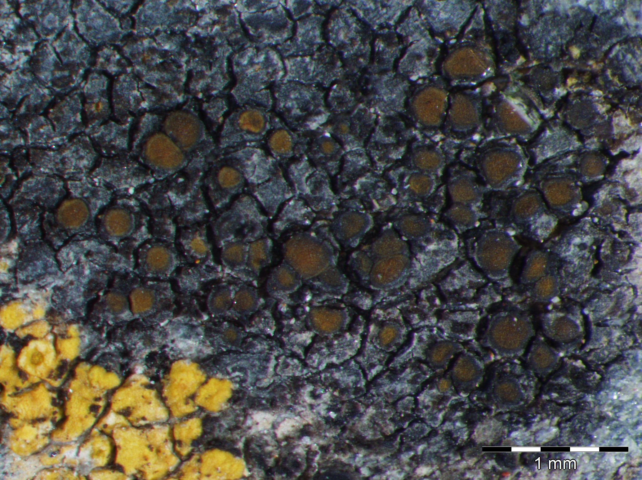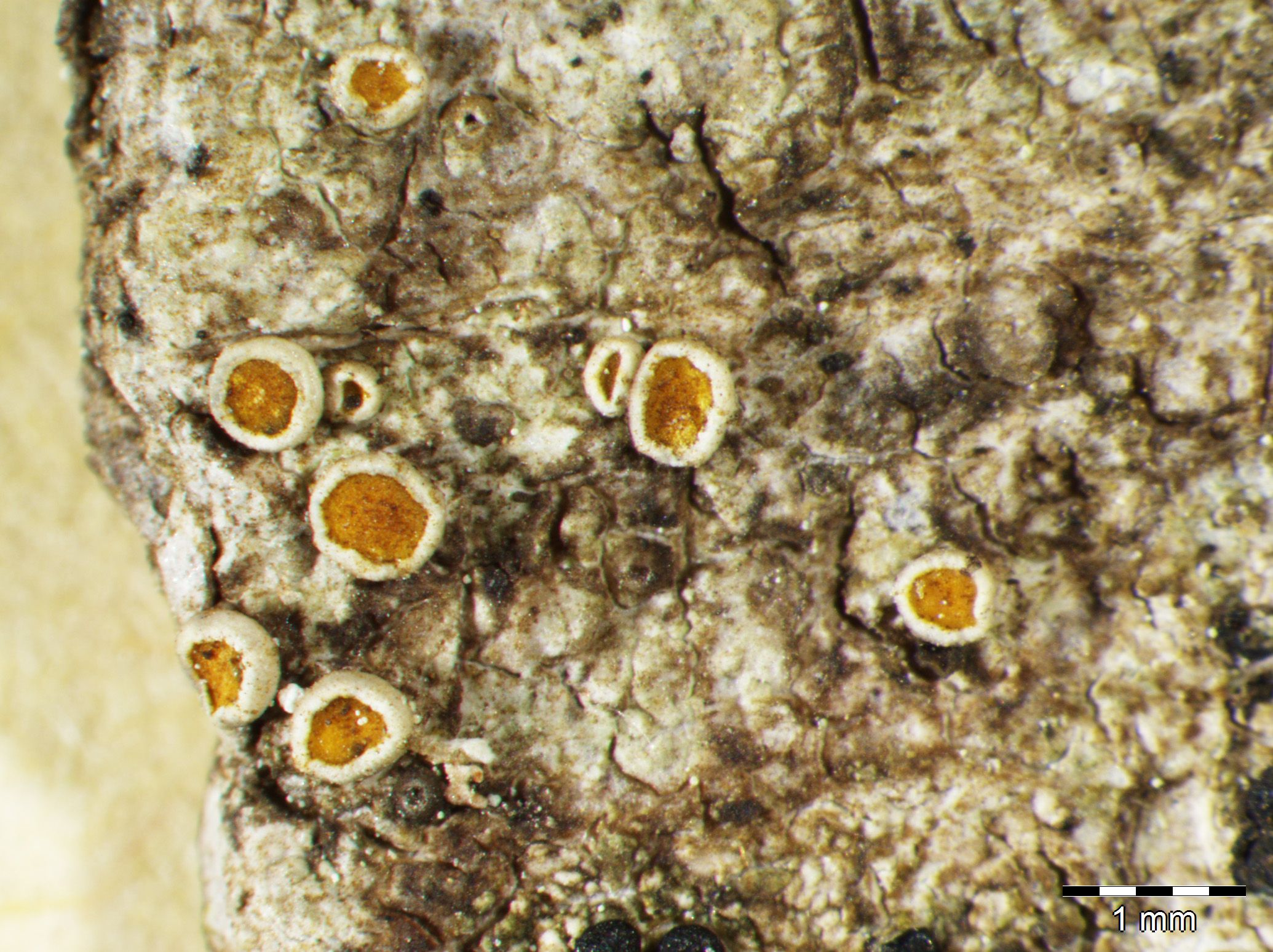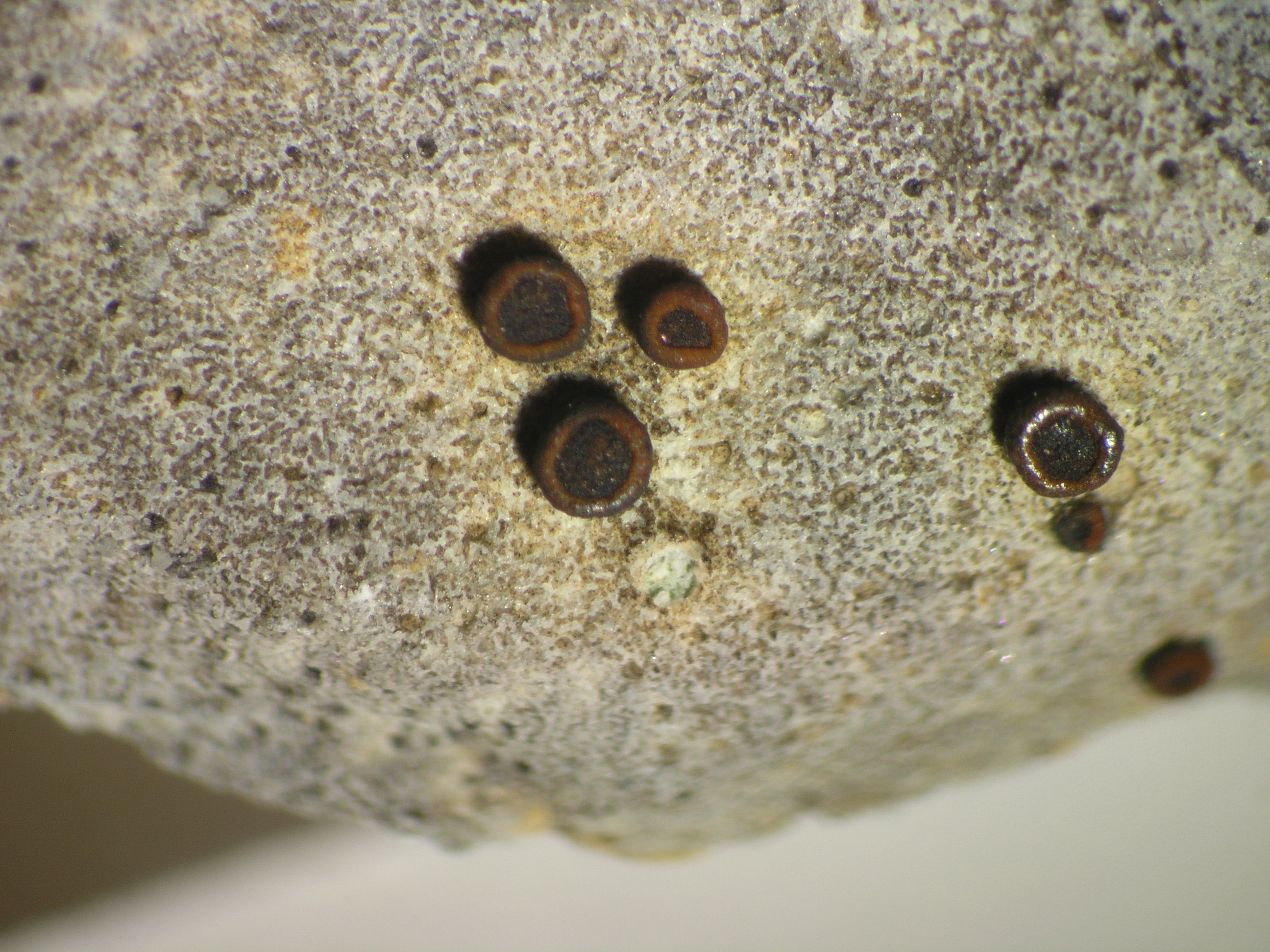 Lakonia, yellow discs, together with C. haematites (red discs) (Sipman & Raus 60123a); click for large picture. Thasos (Sipman & Raus 58959); click for large picture.