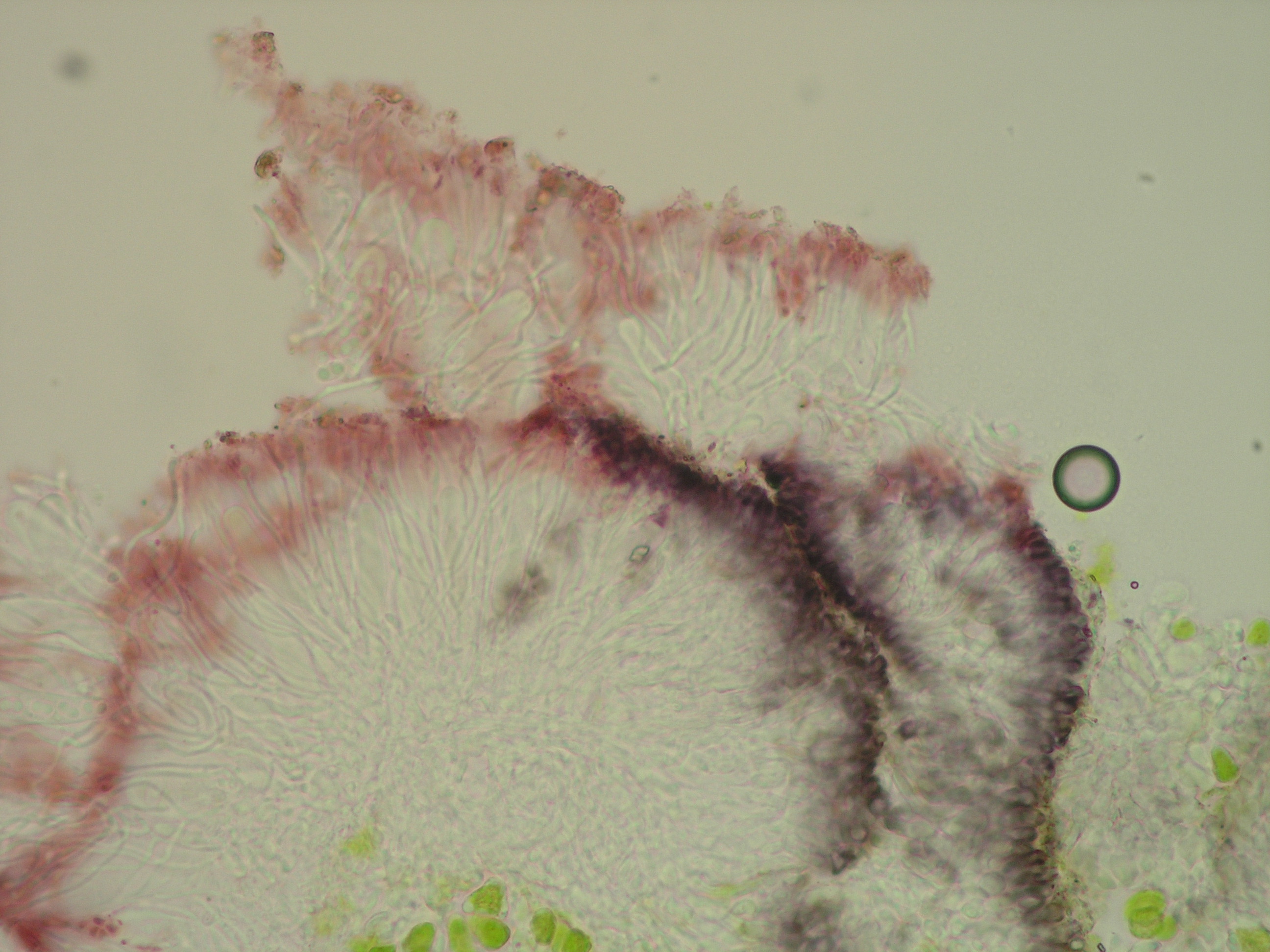 (Sipman 53889); picture length = 7 mm; click for large picture. section of apothecium in KOH, showing different reaction of epithecium and excipulum(Sipman 53889); picture length = 310 mu; click for large picture.