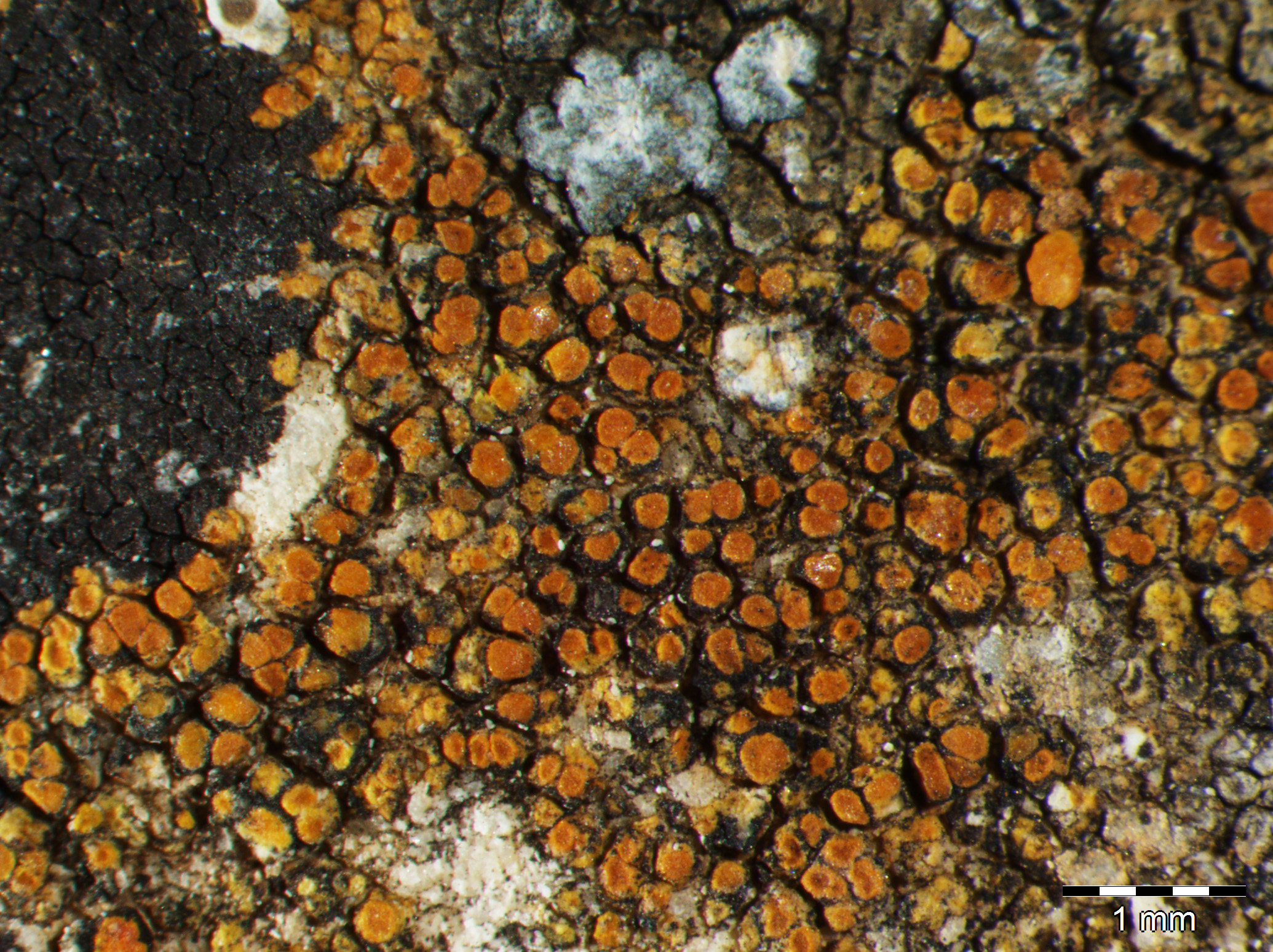 Caloplaca necator Poelt & Clauzade - NOTE: identification uncertain; seems to grow over Acarospora vs. nitrophila scattered among Aspicilia vs. intermutans.