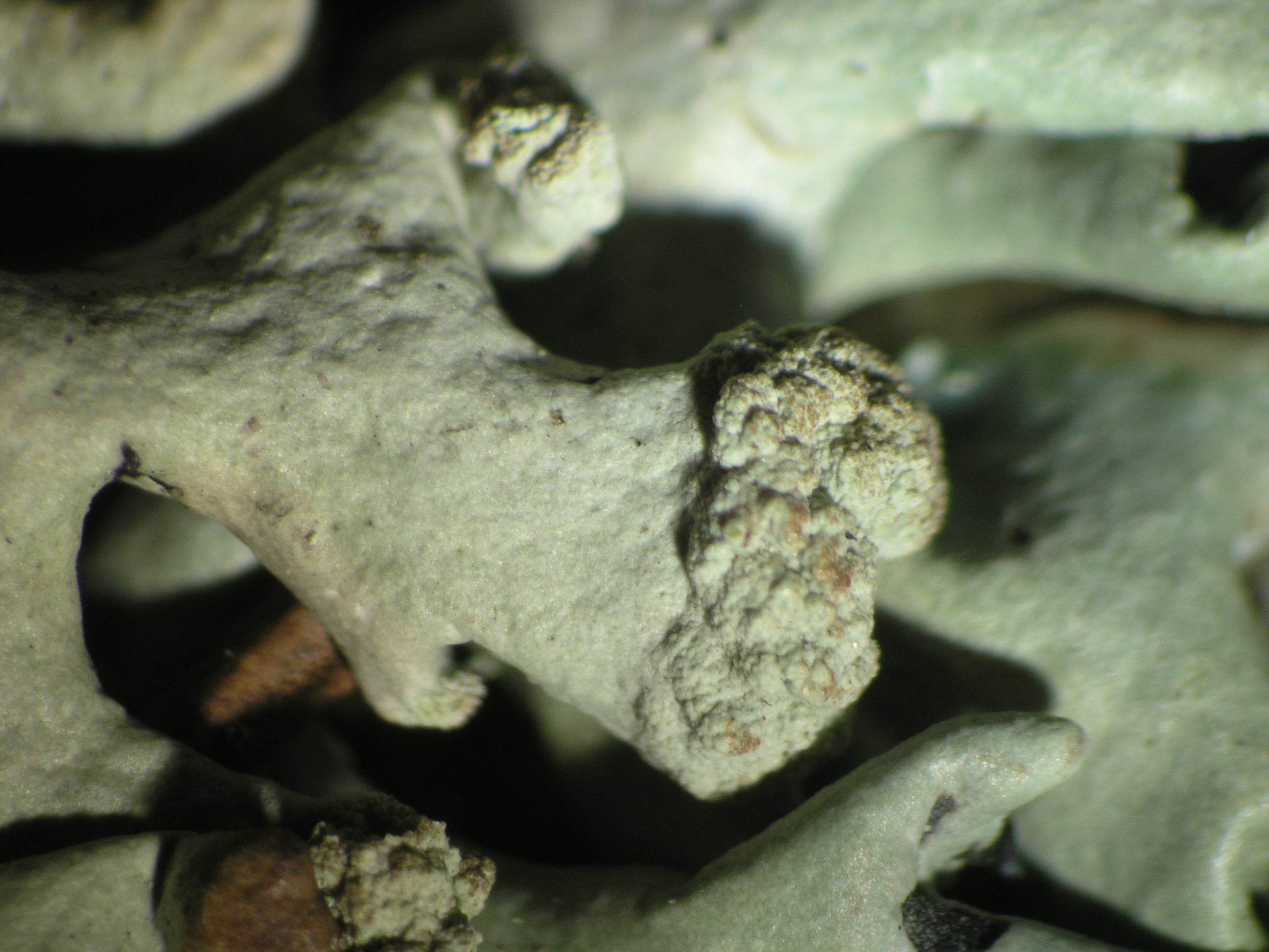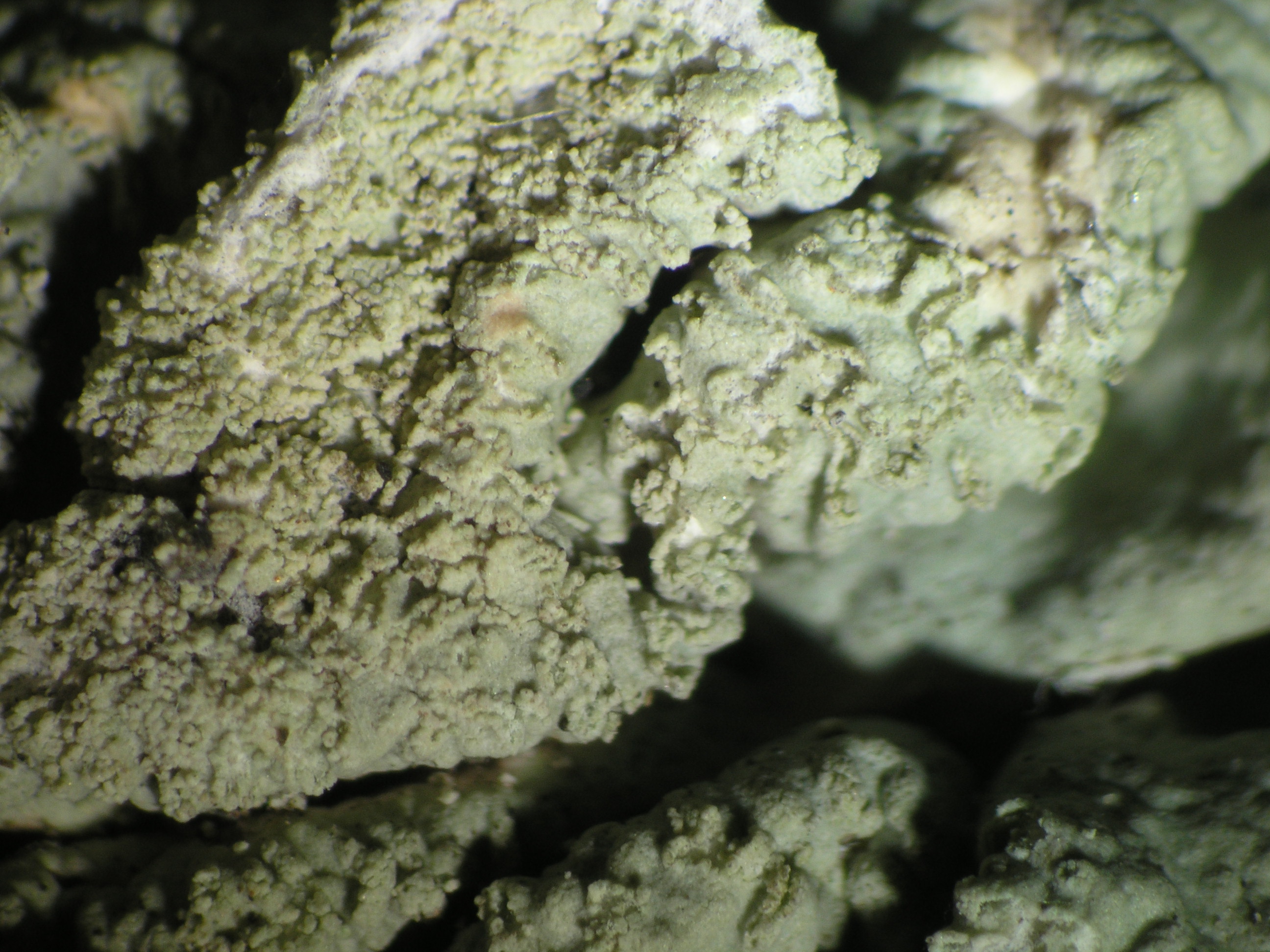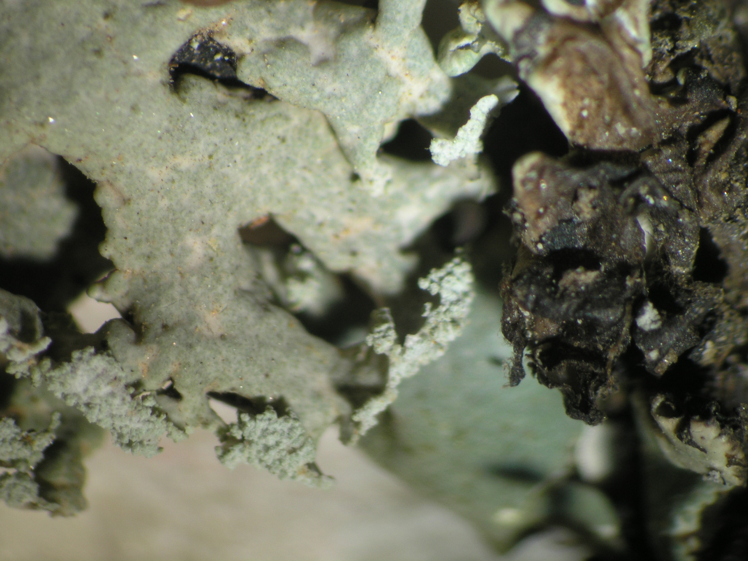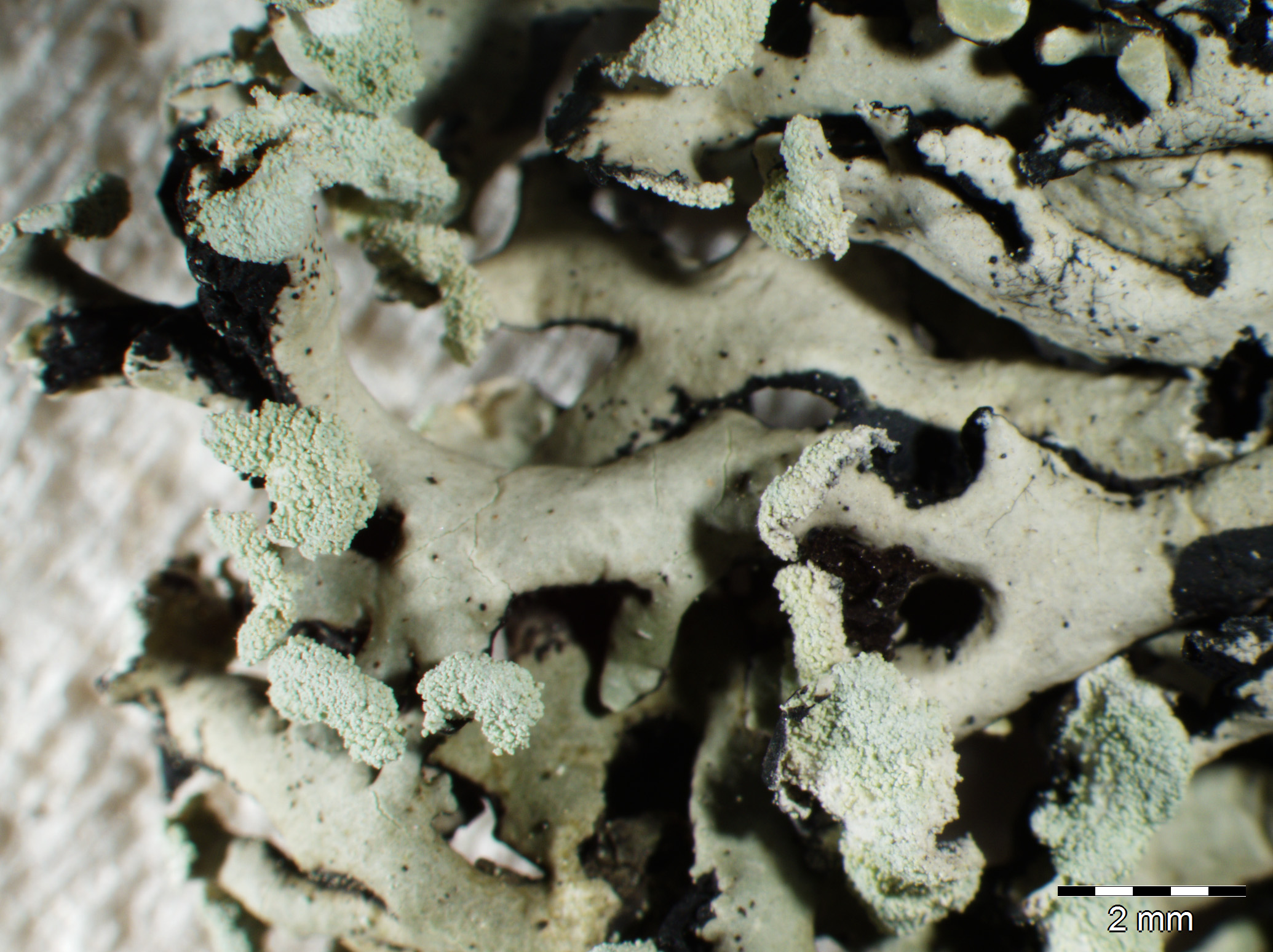 Hypogymnia laminisorediata D.Hawksw. & Poelt - NOTE: Doubtfully distinct from H. farinacea. Poor specimens with soralia largely restricted to the terminal parts of the lobes seem to transgrade into H. tubulosa.