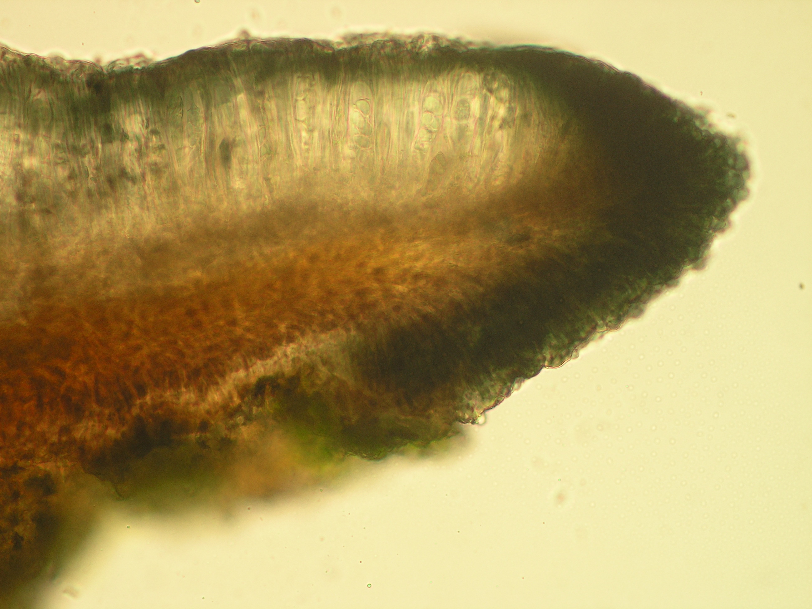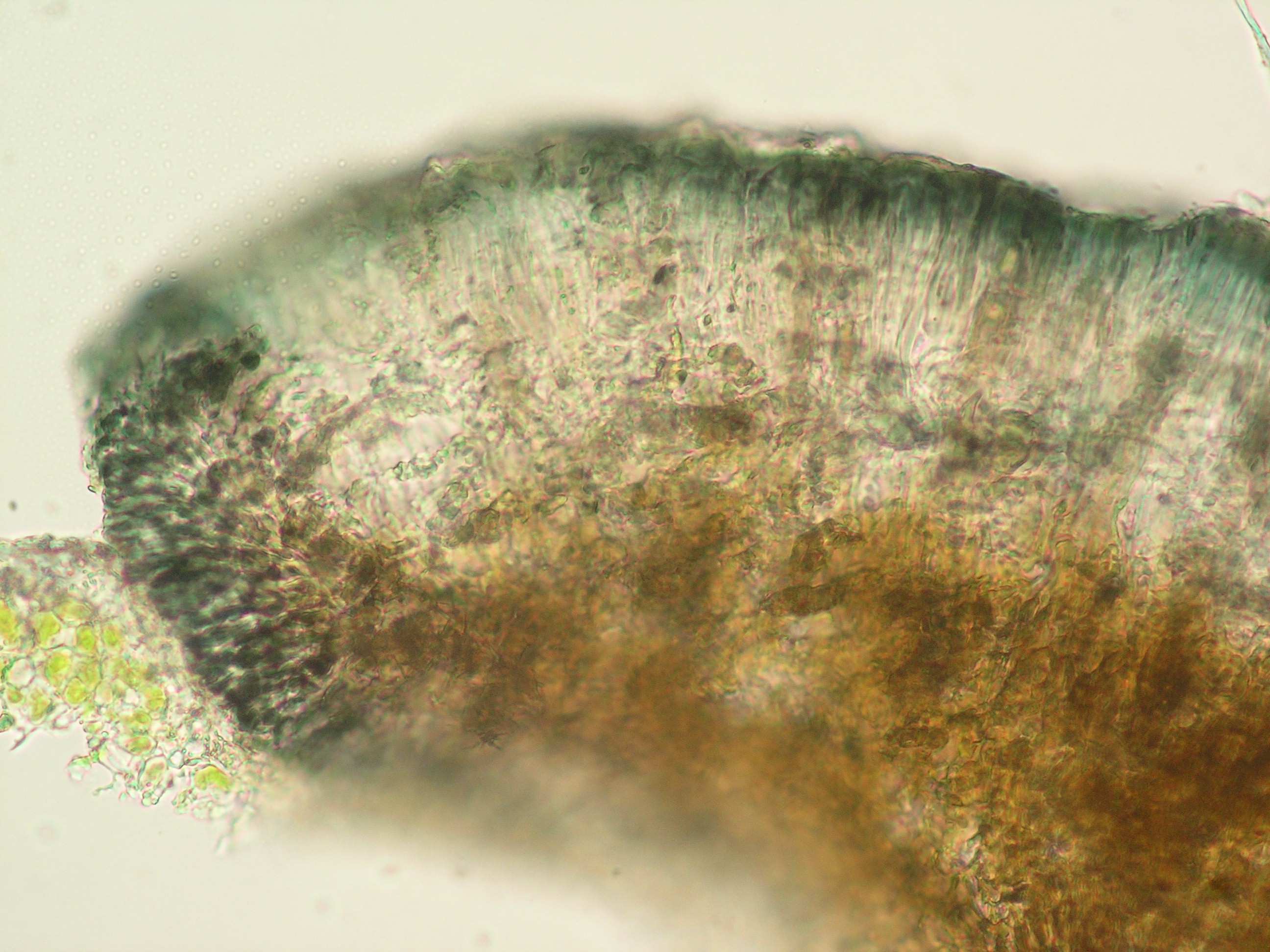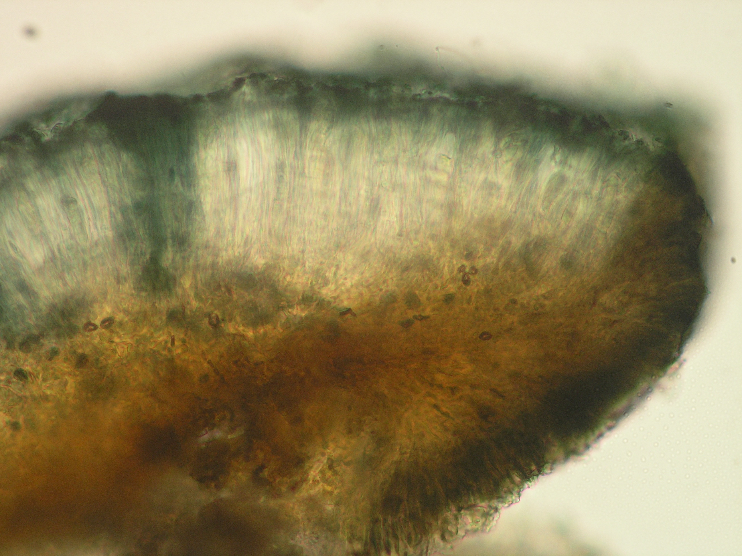 (Sipman 54557) apothecium section, showing pigment distribution; picture length = 310 mu; click for large picture.