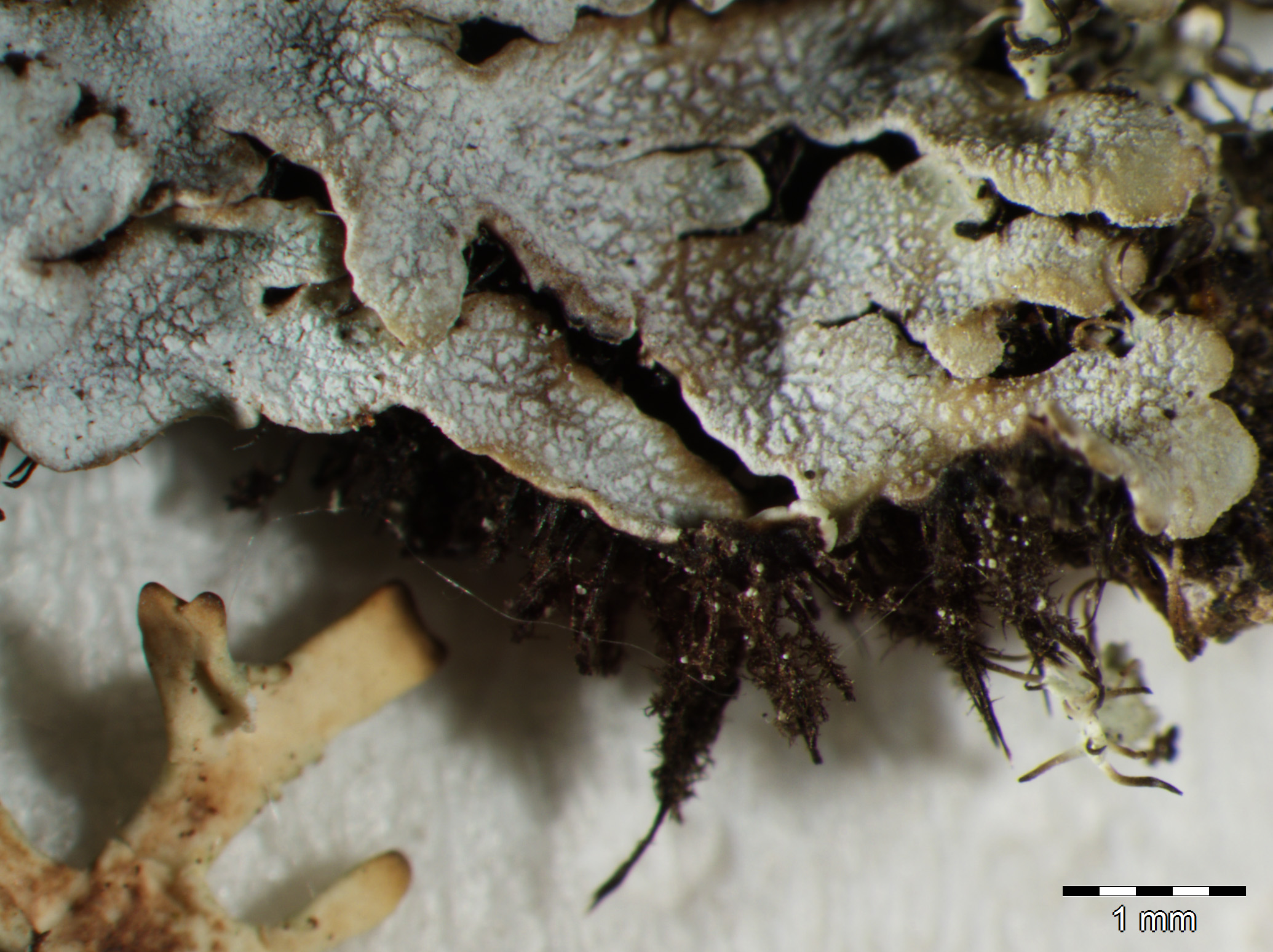 Methana peninsula; showing rhizines with perpendicular branchlets (Sipman & Raus 60470); click for enlargement.