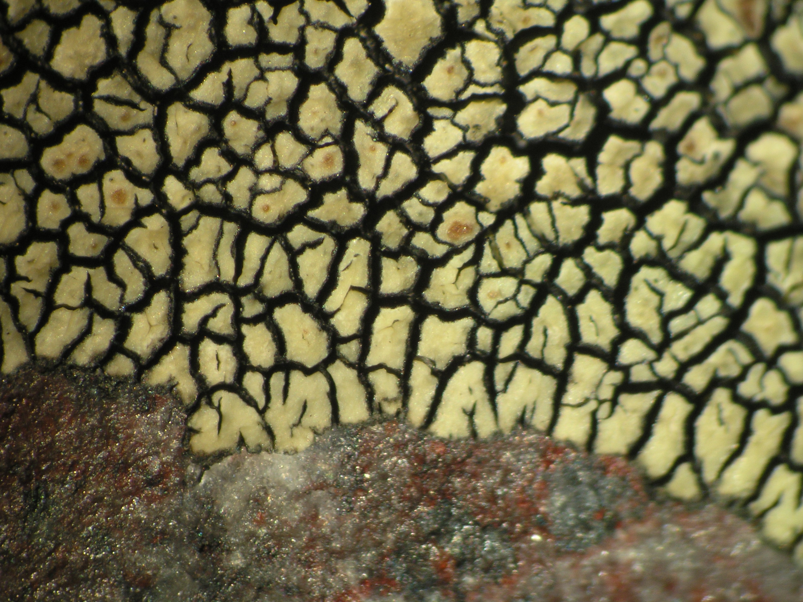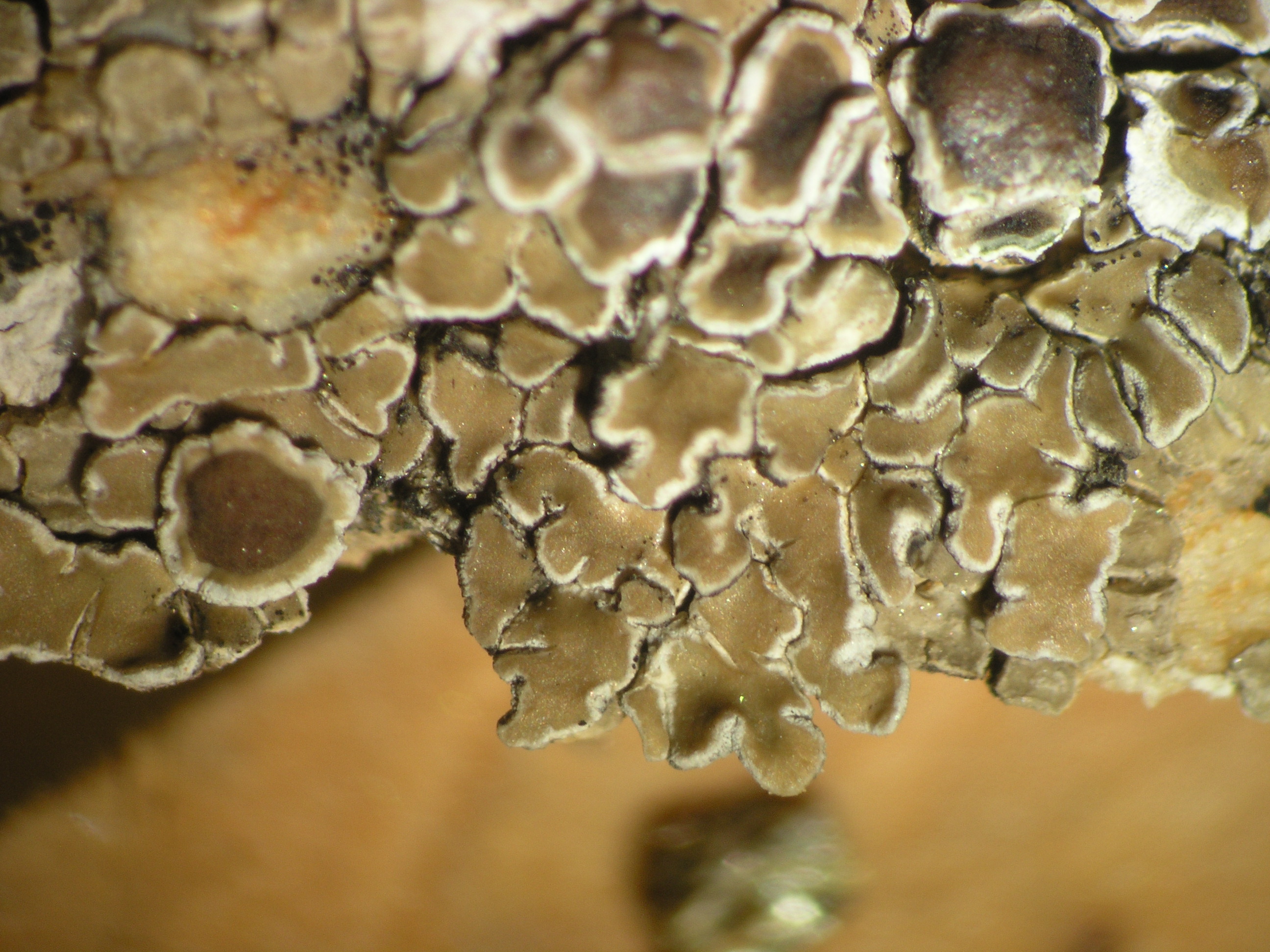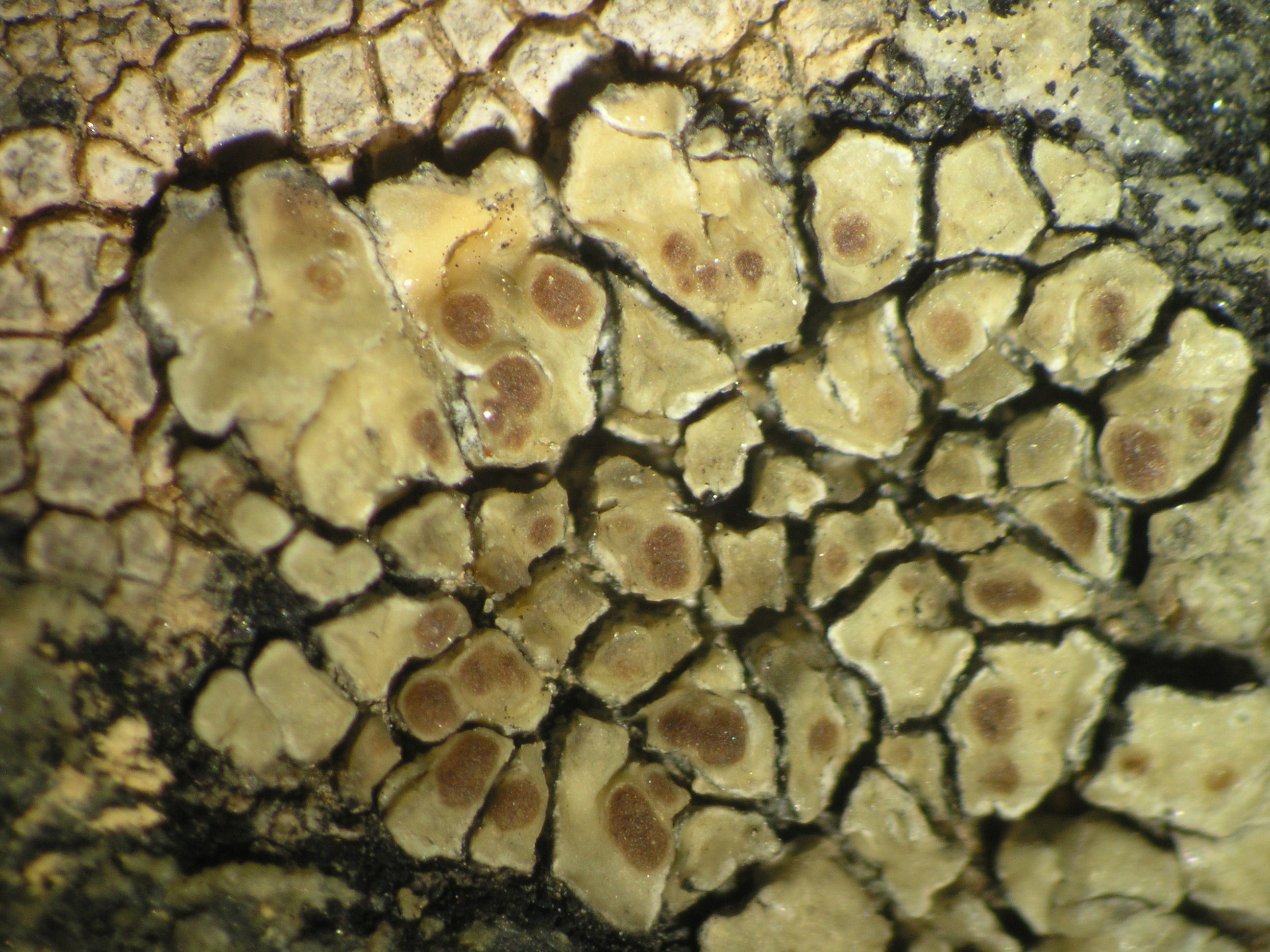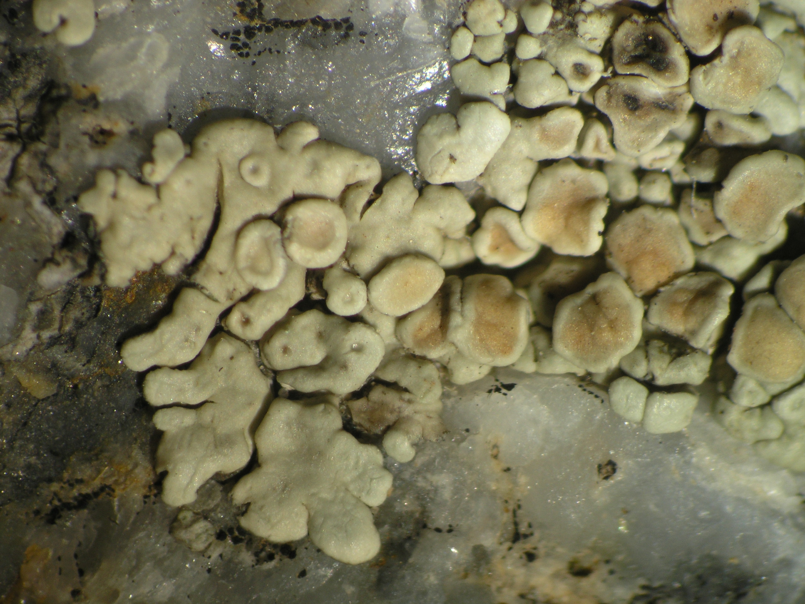 (Sipman 53652); picture length = 7 mm; click for enlargement. (Sipman 53737) with Acarospora sp. (brown); picture length = 7 mm; click for enlargement.