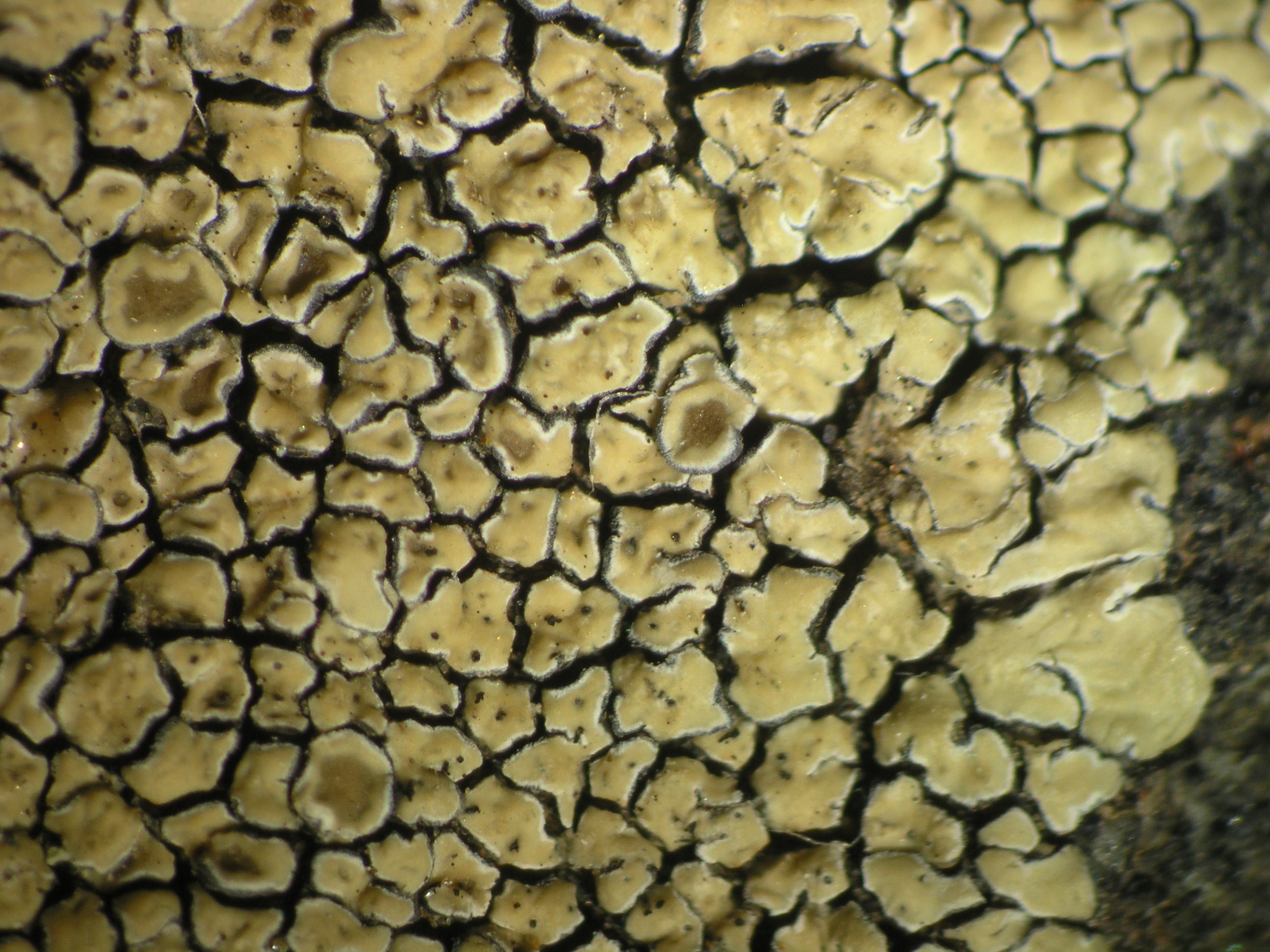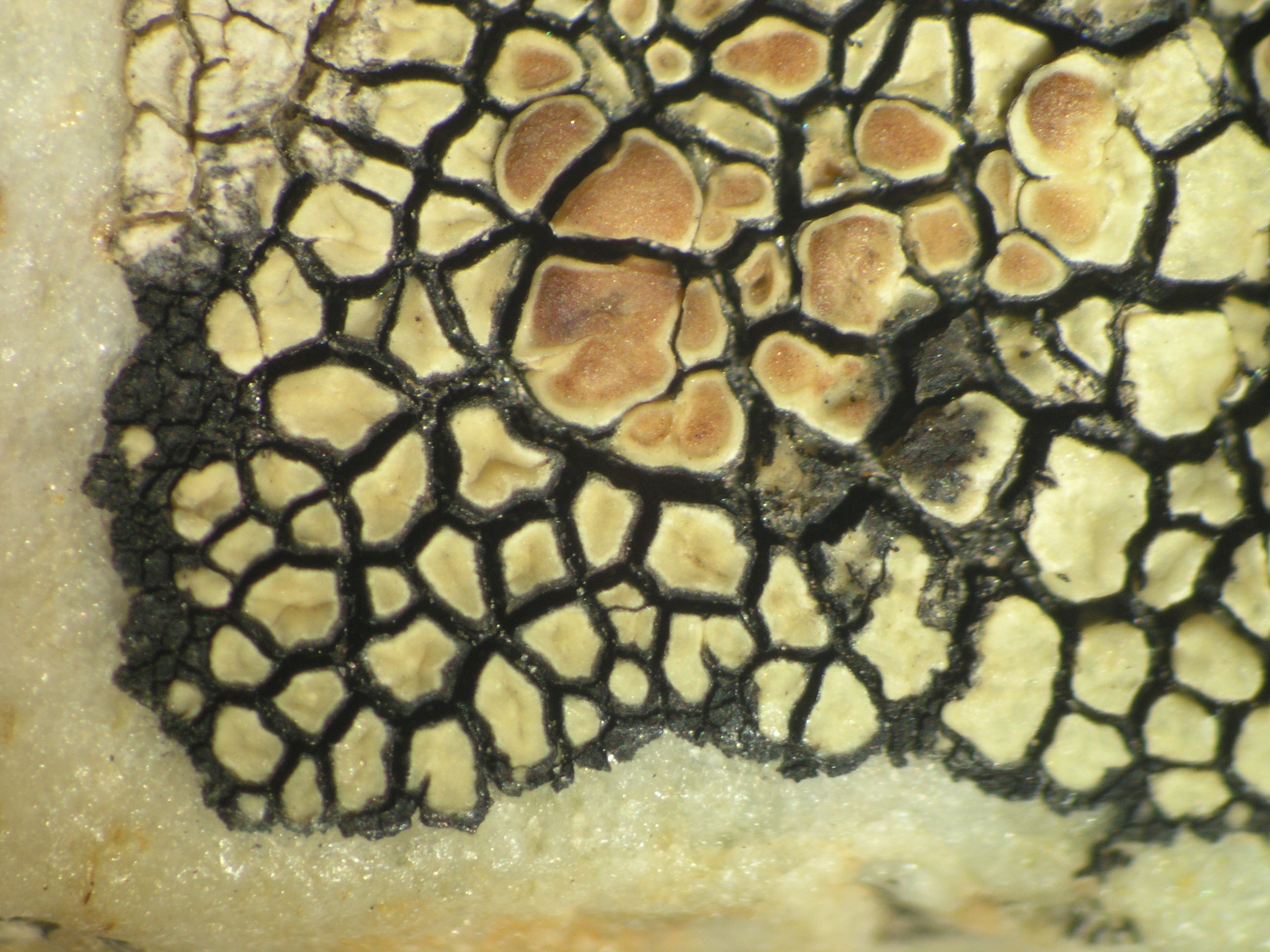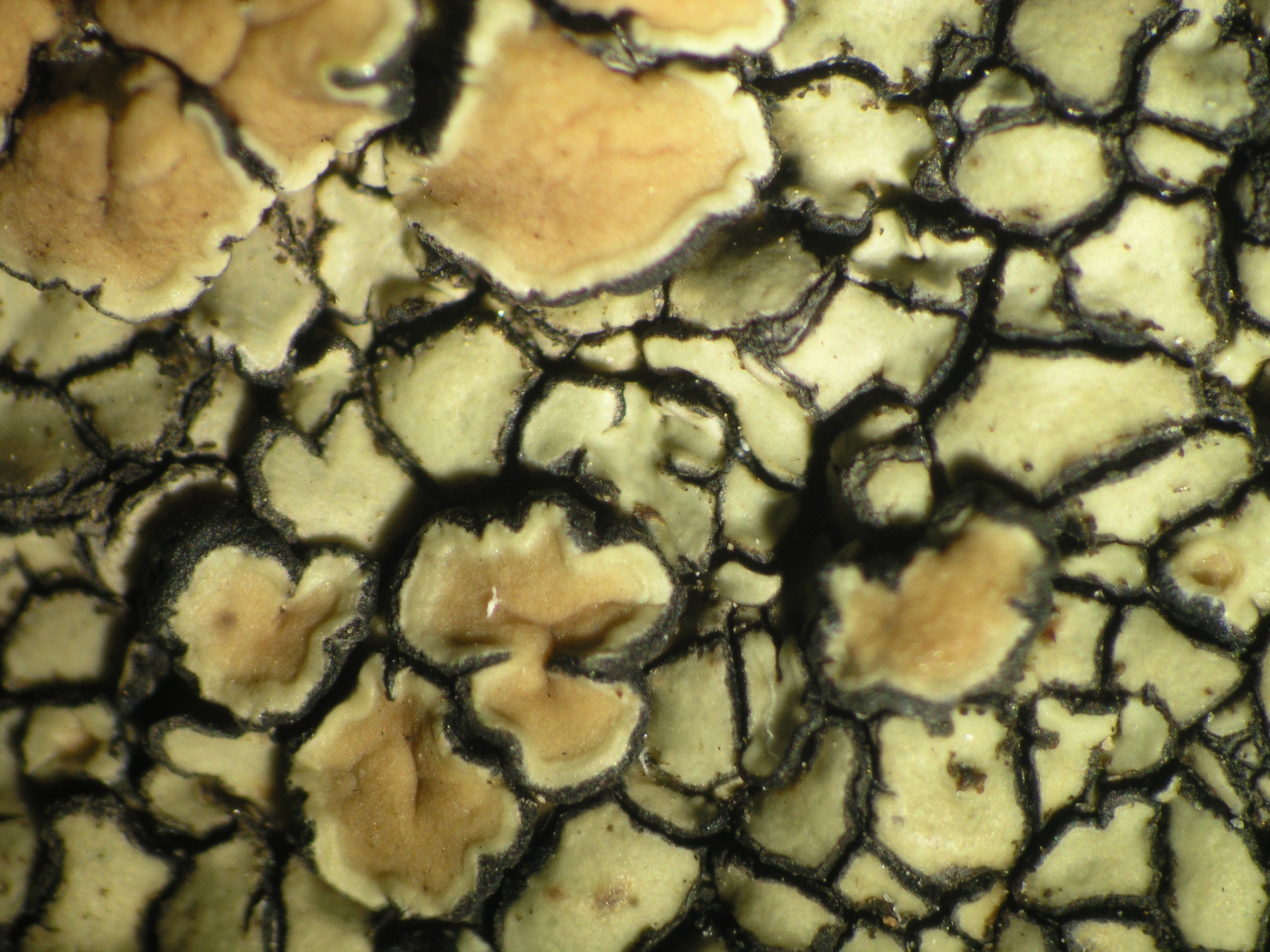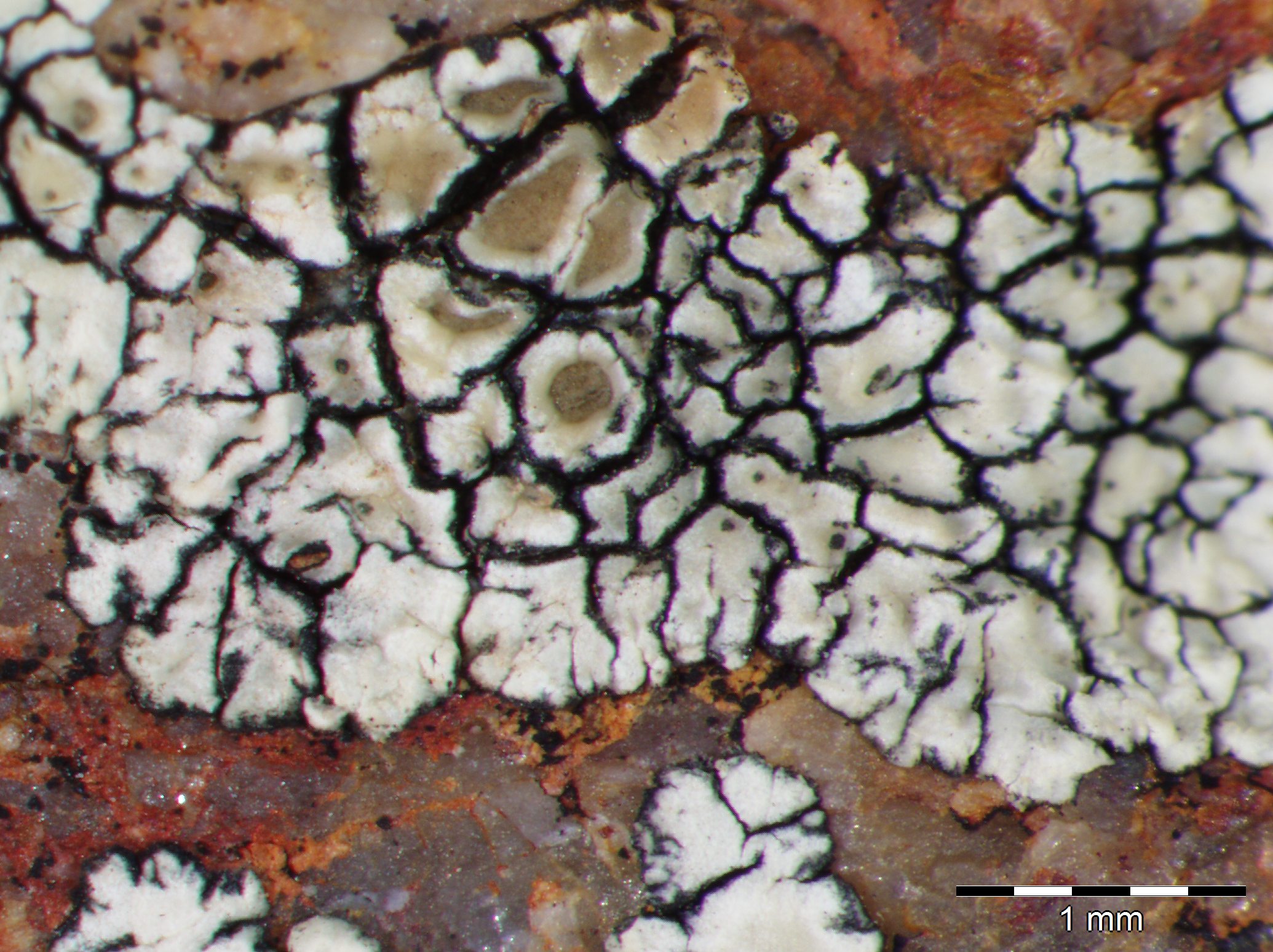 (Sipman 53652); picture length = 7 mm; click for enlargement. (Sipman 53737) with Acarospora sp. (brown); picture length = 7 mm; click for enlargement.