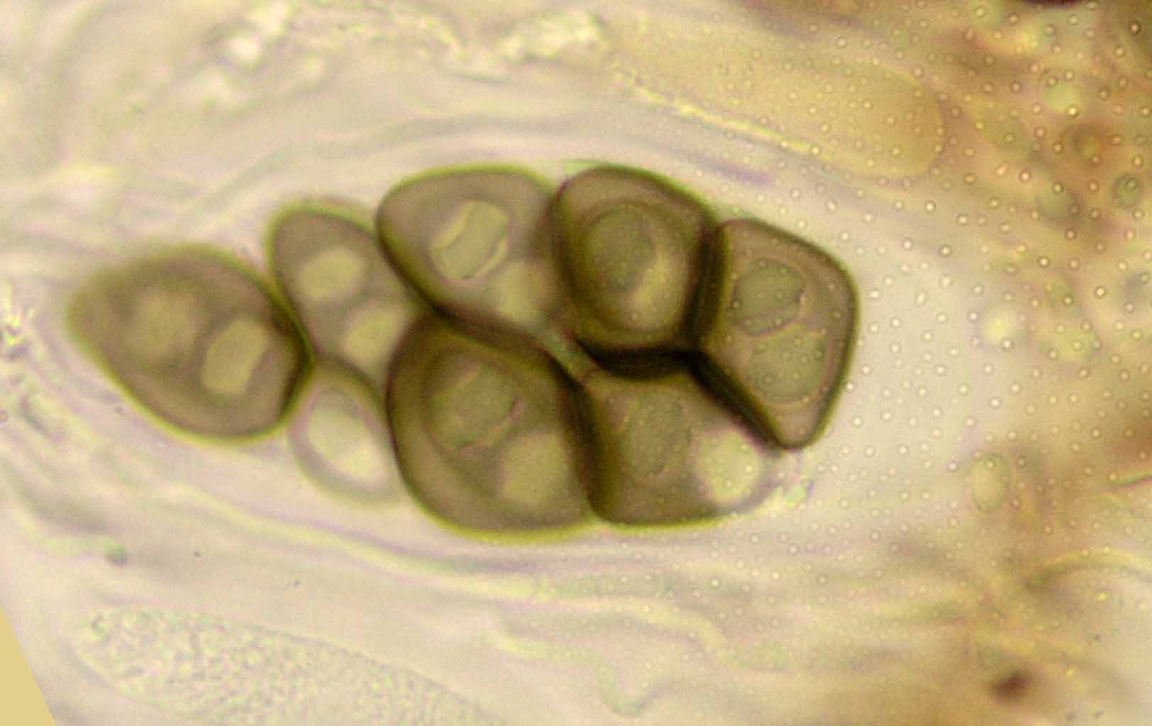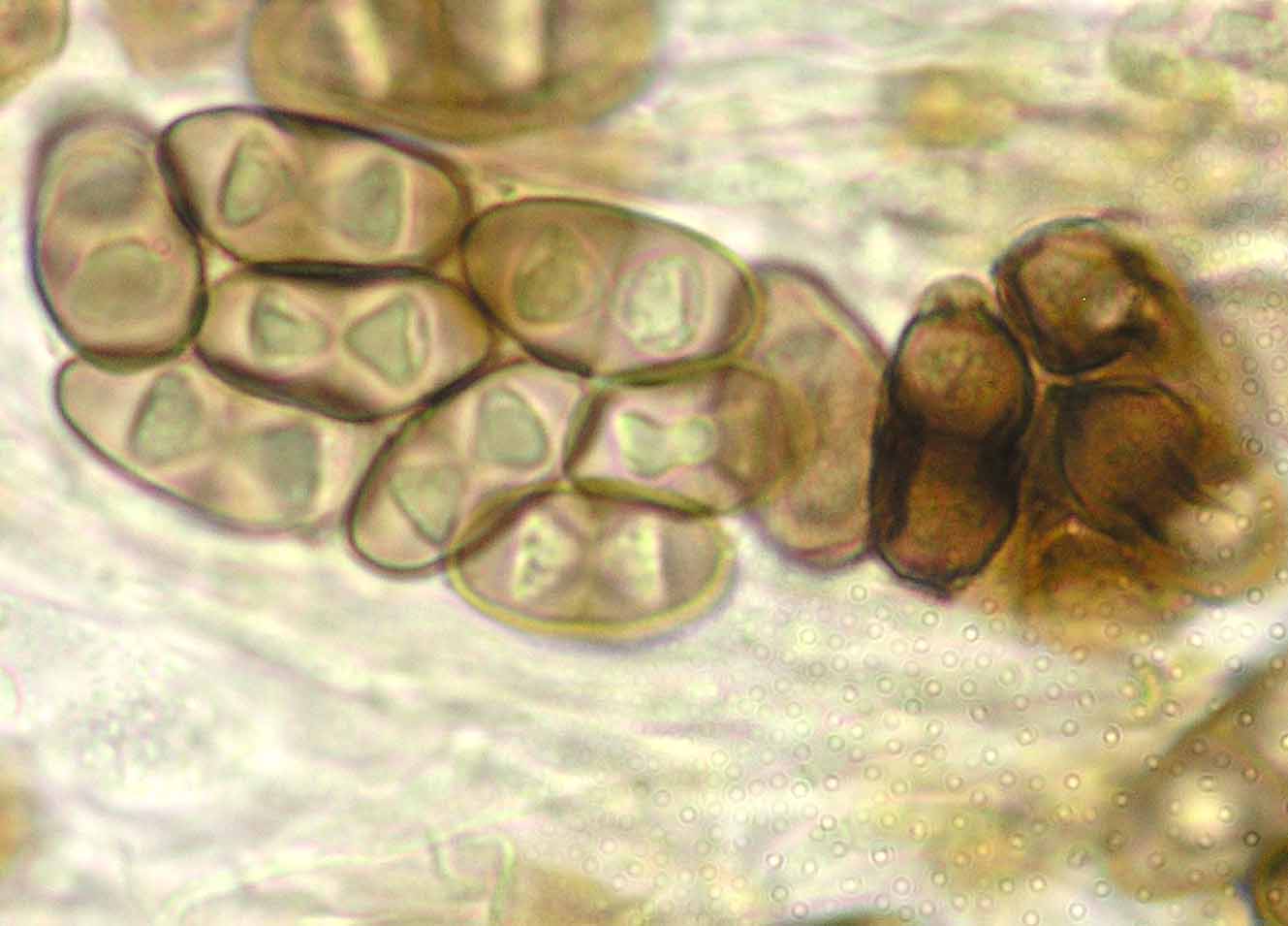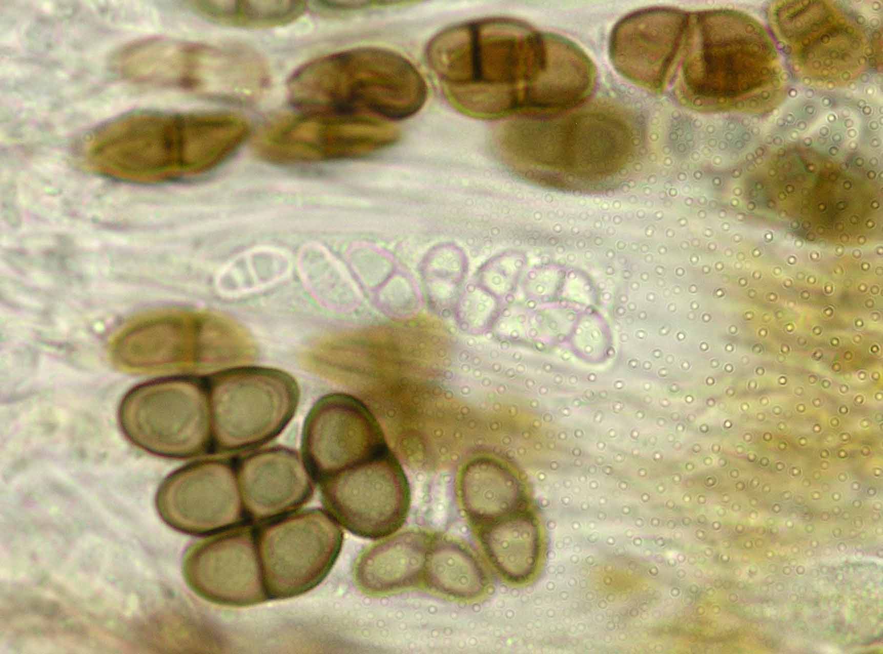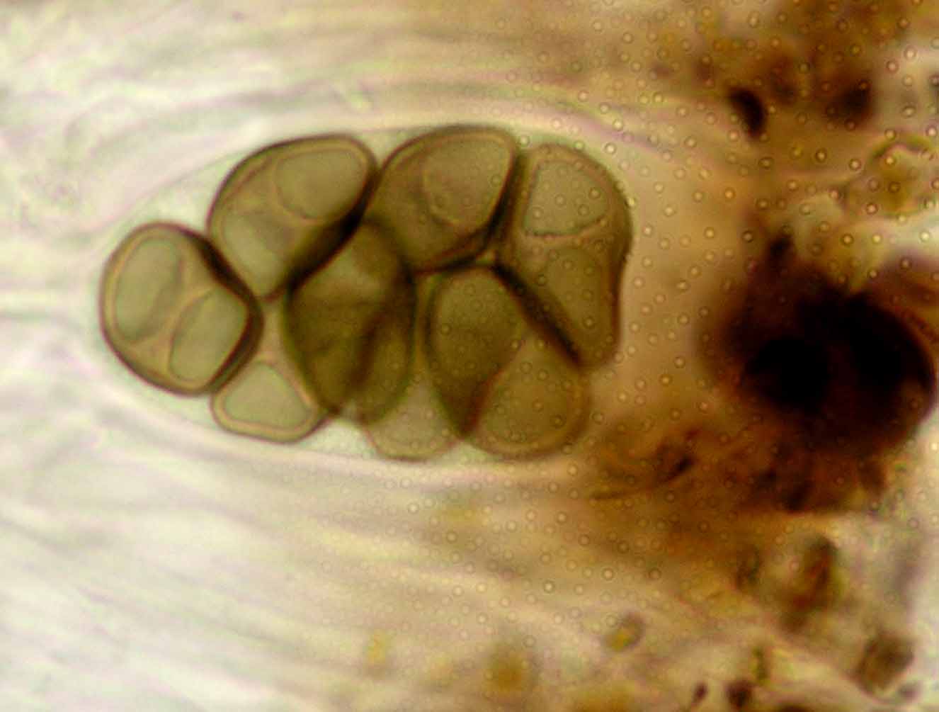 (Sipman 54255pp) spores in KOH (note epithecium staining); picture length = 130 mu; click for enlargement. (Sipman 54255pp) spores in KOH (note epithecium staining); picture length = 130 mu; click for enlargement.