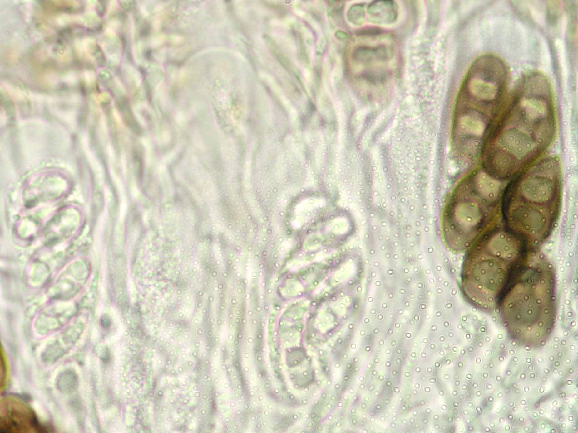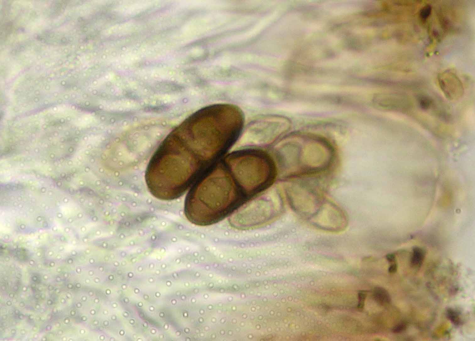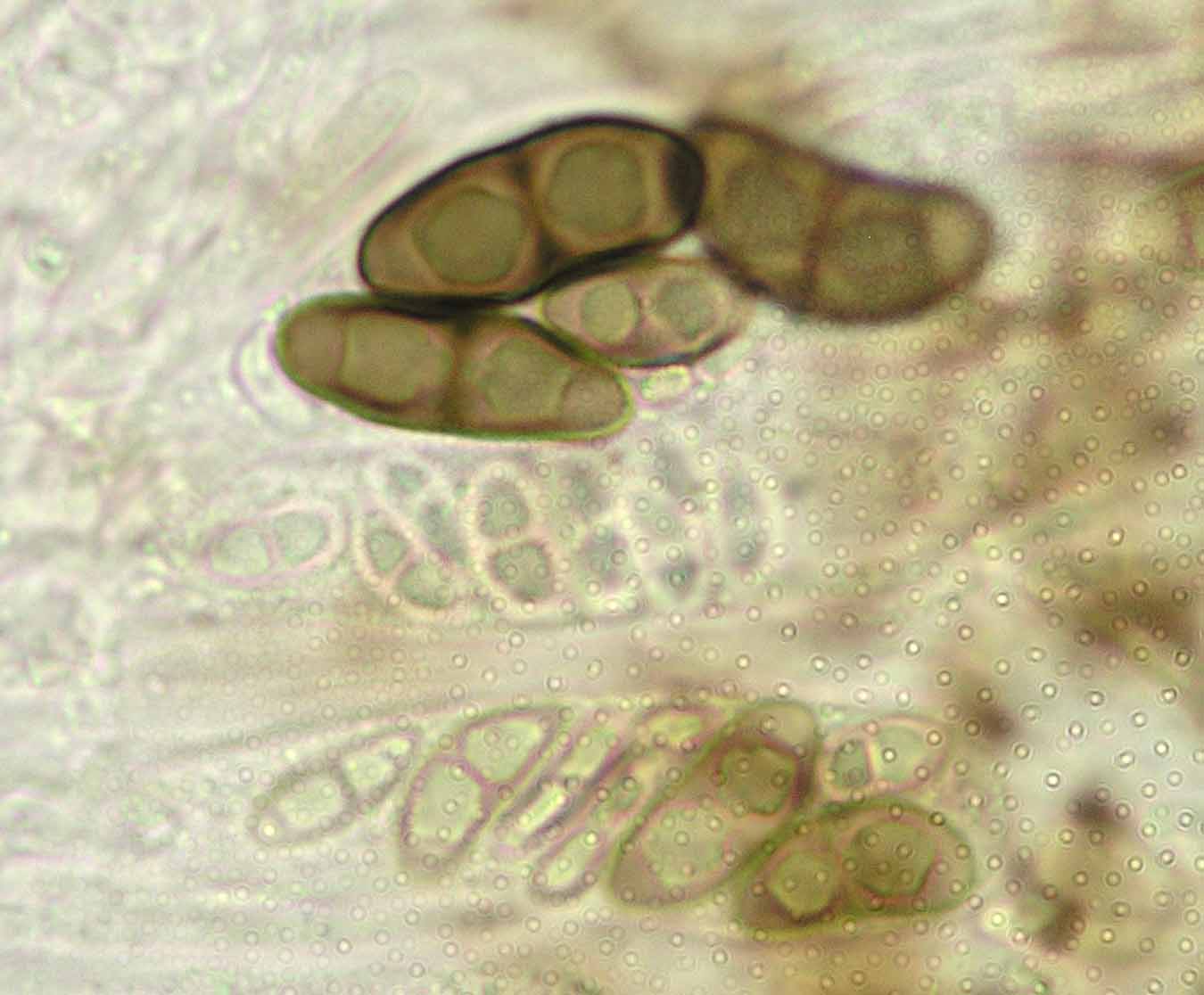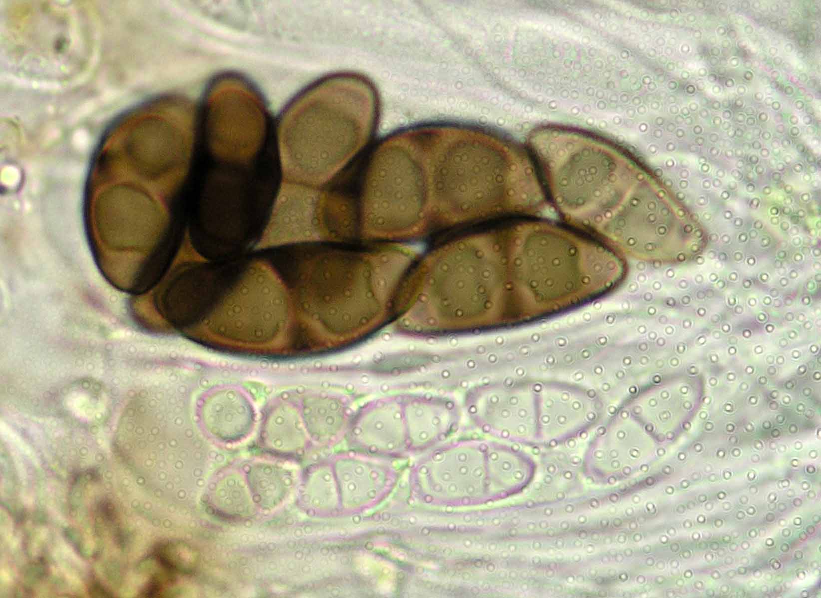 (Sipman 54255pp) spores in KOH (note epithecium staining); picture length = 130 mu; click for enlargement. (Sipman 54255pp) spores in KOH (note epithecium staining); picture length = 130 mu; click for enlargement.