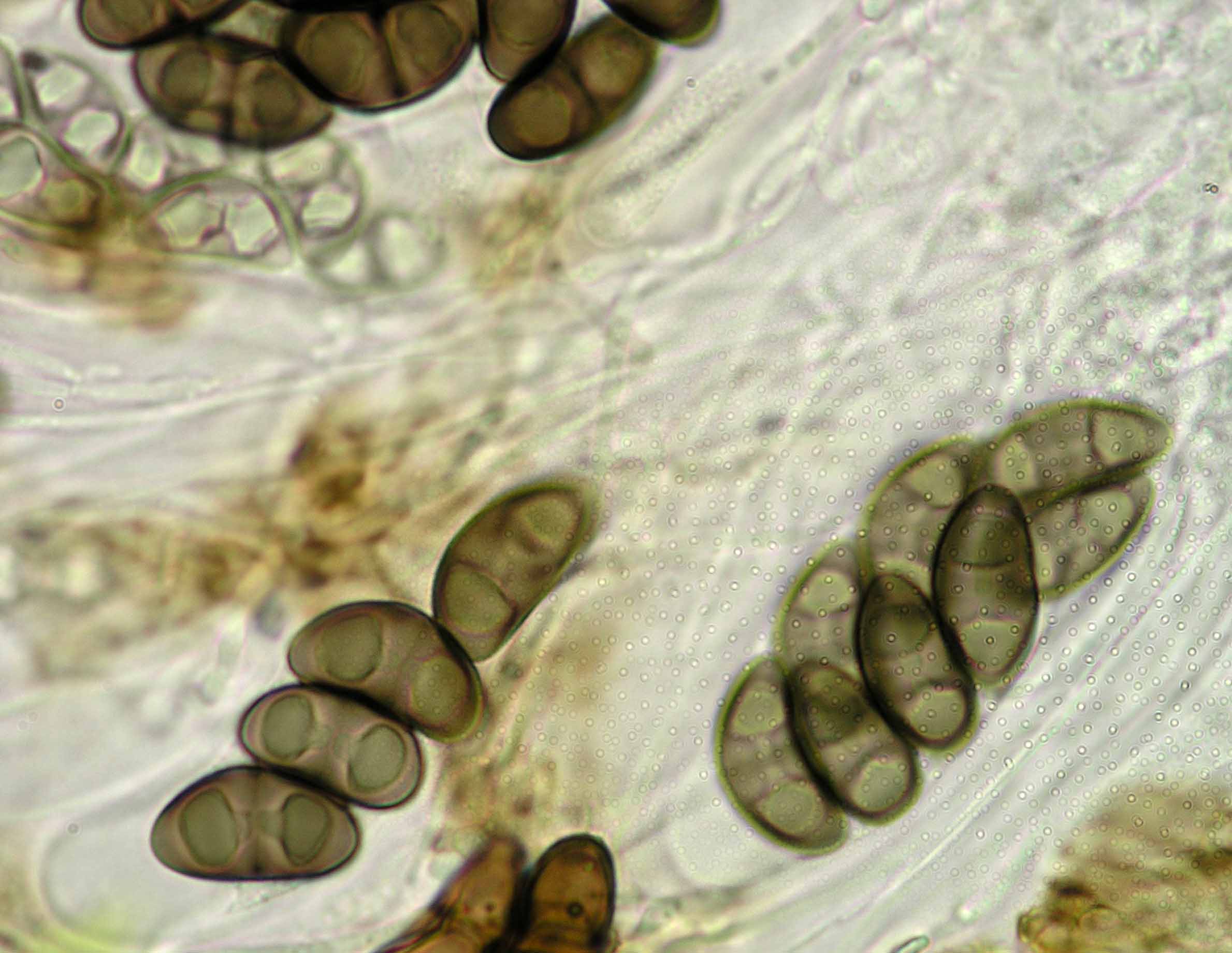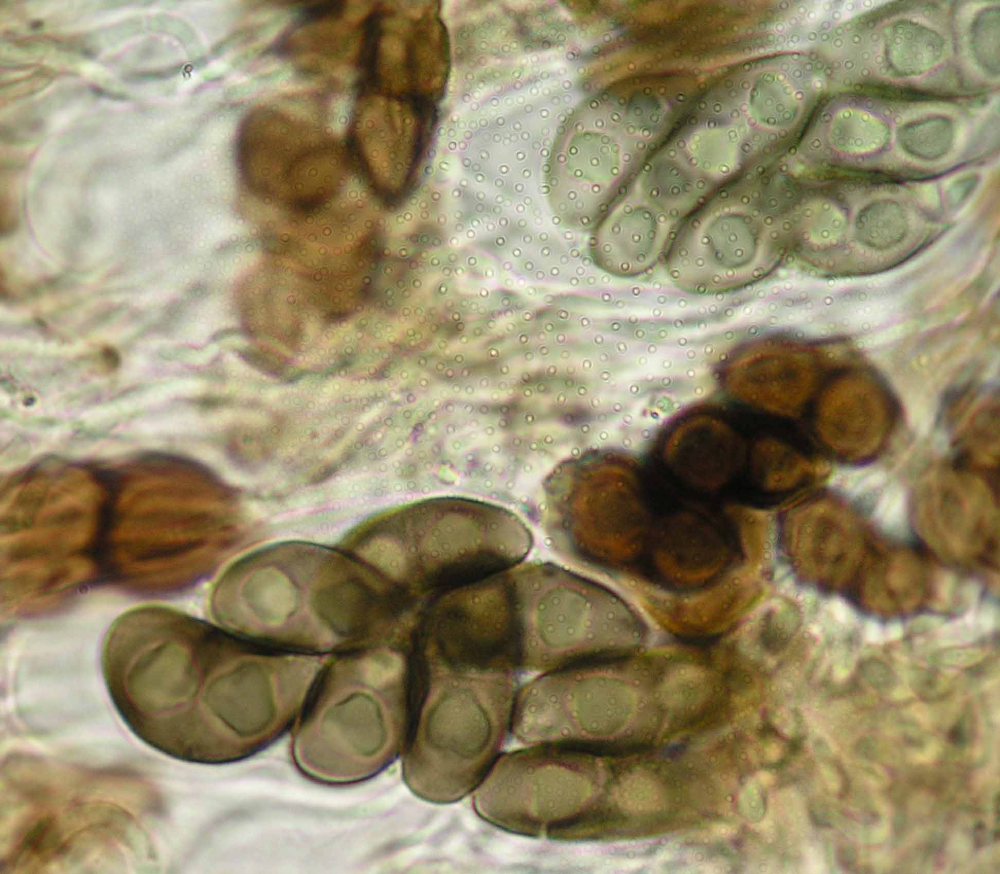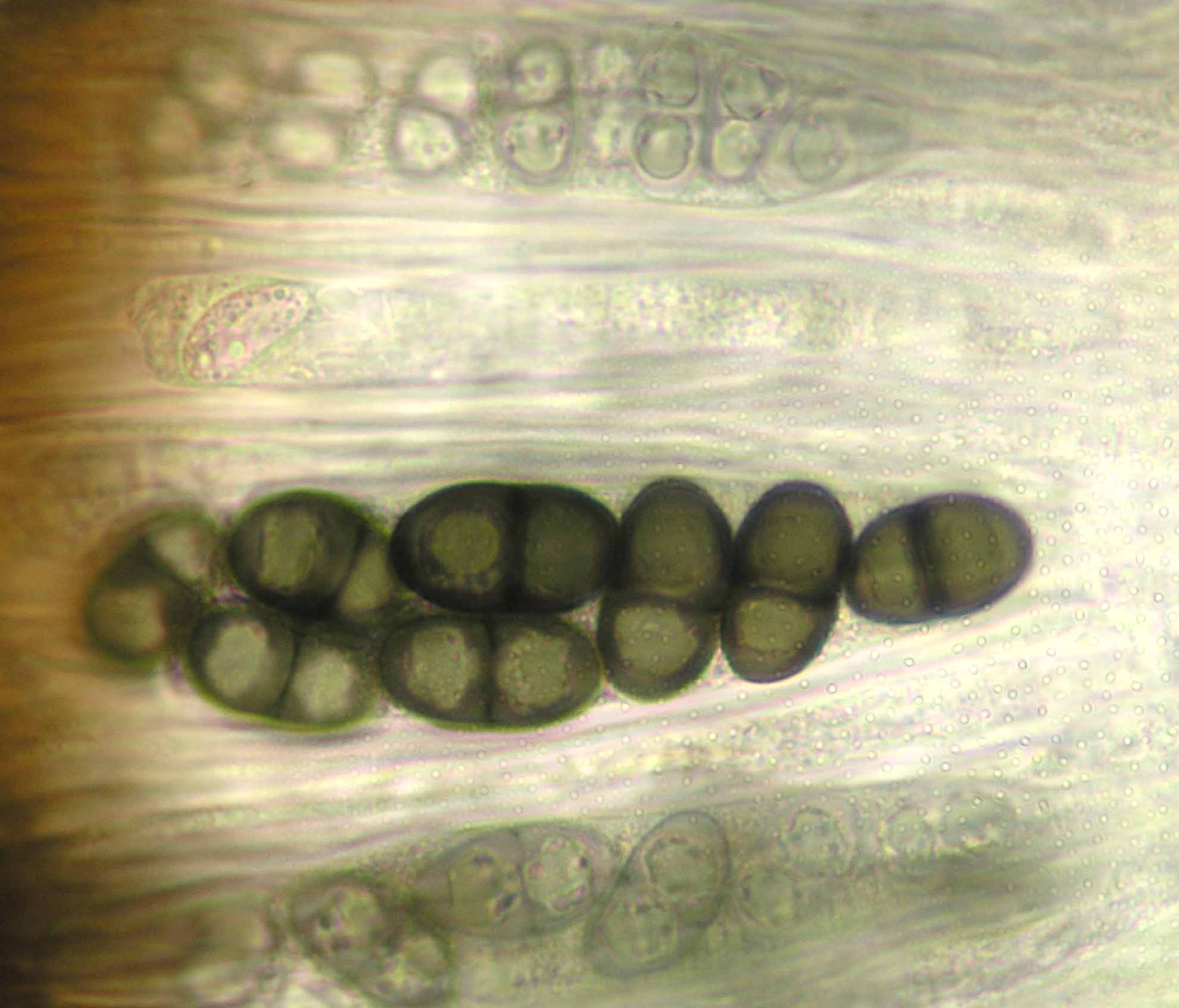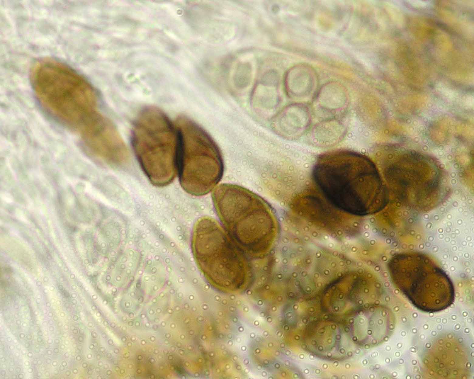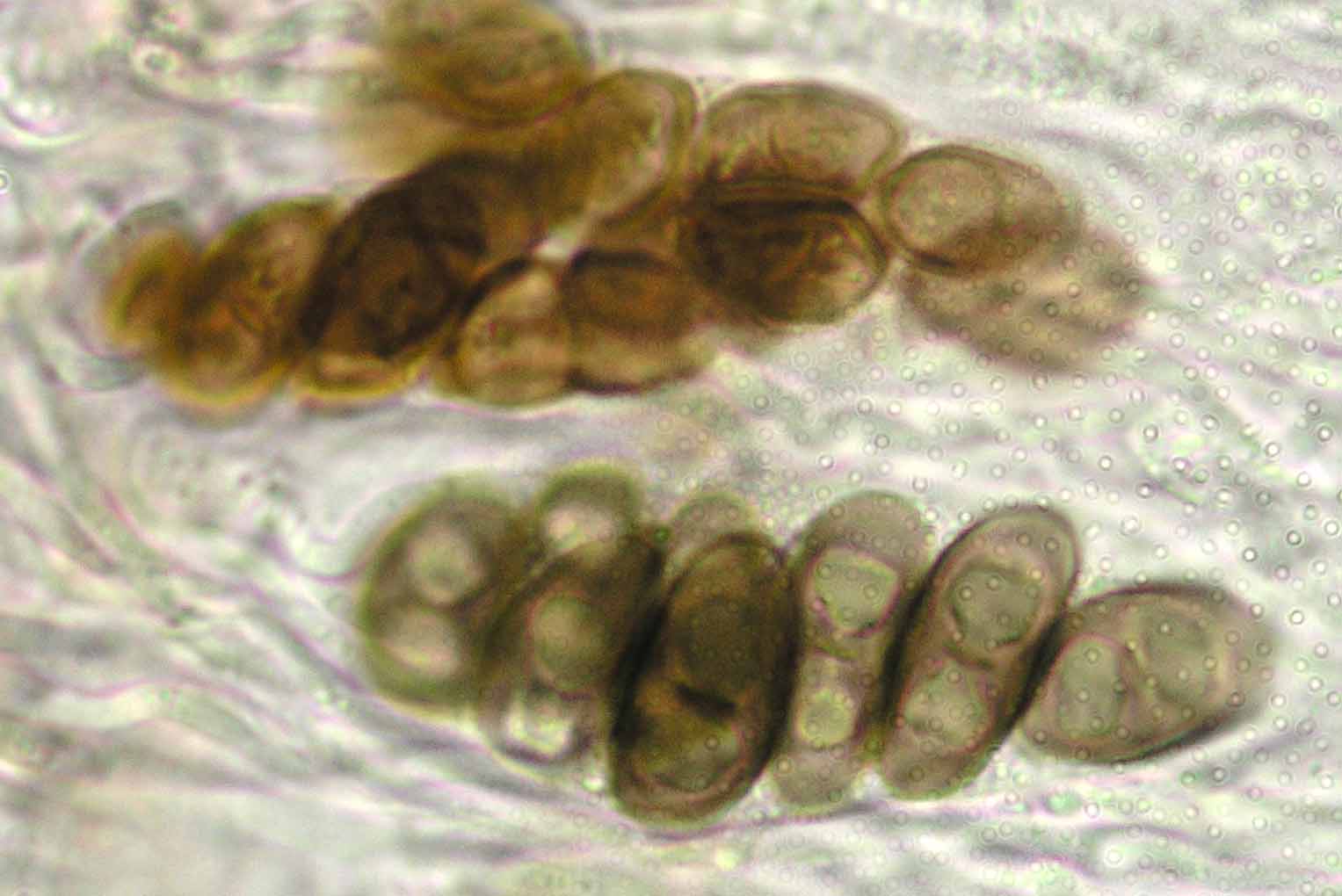 (Sipman 54255pp) spores in KOH (note epithecium staining); picture length = 130 mu; click for enlargement. (Sipman 54255pp) spores in KOH (note epithecium staining); picture length = 130 mu; click for enlargement.