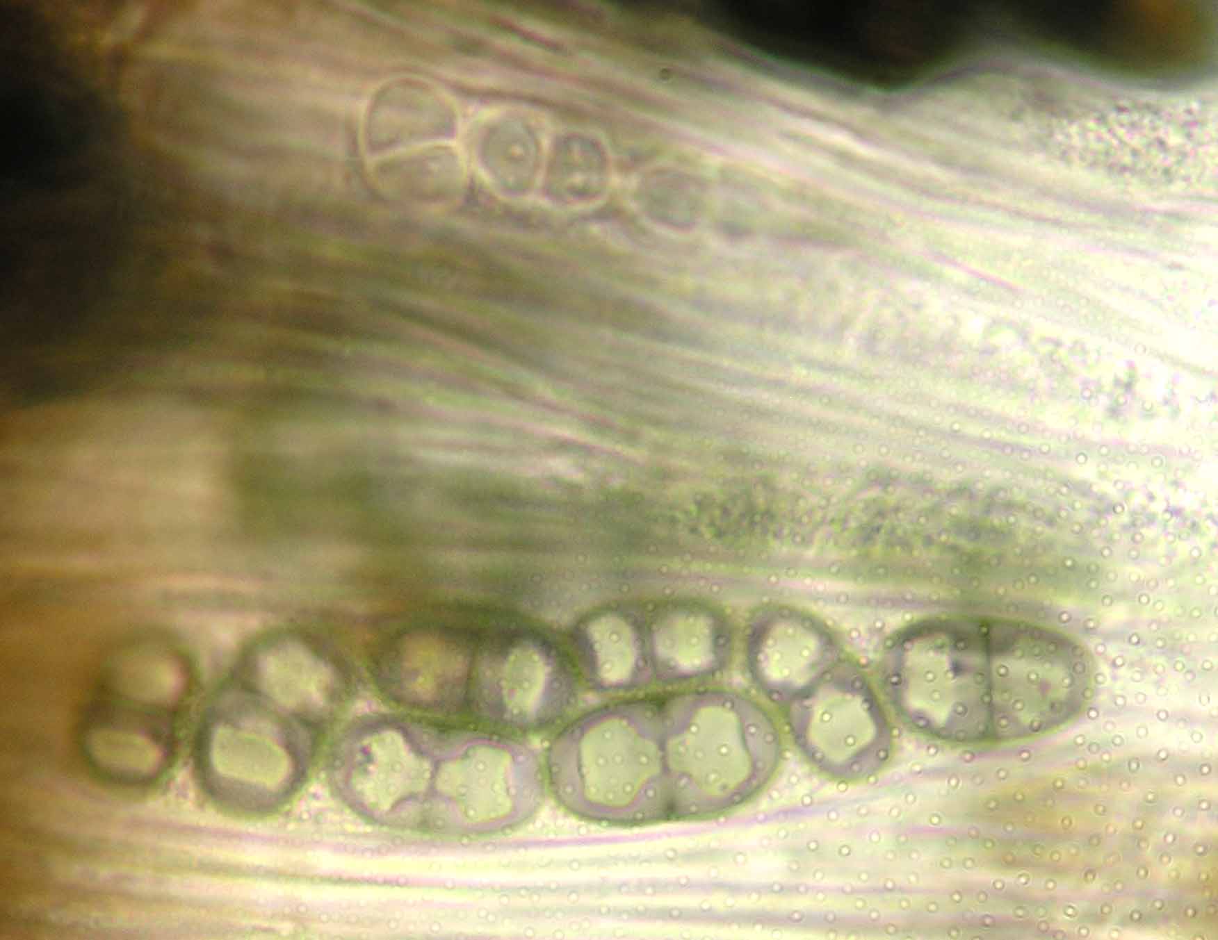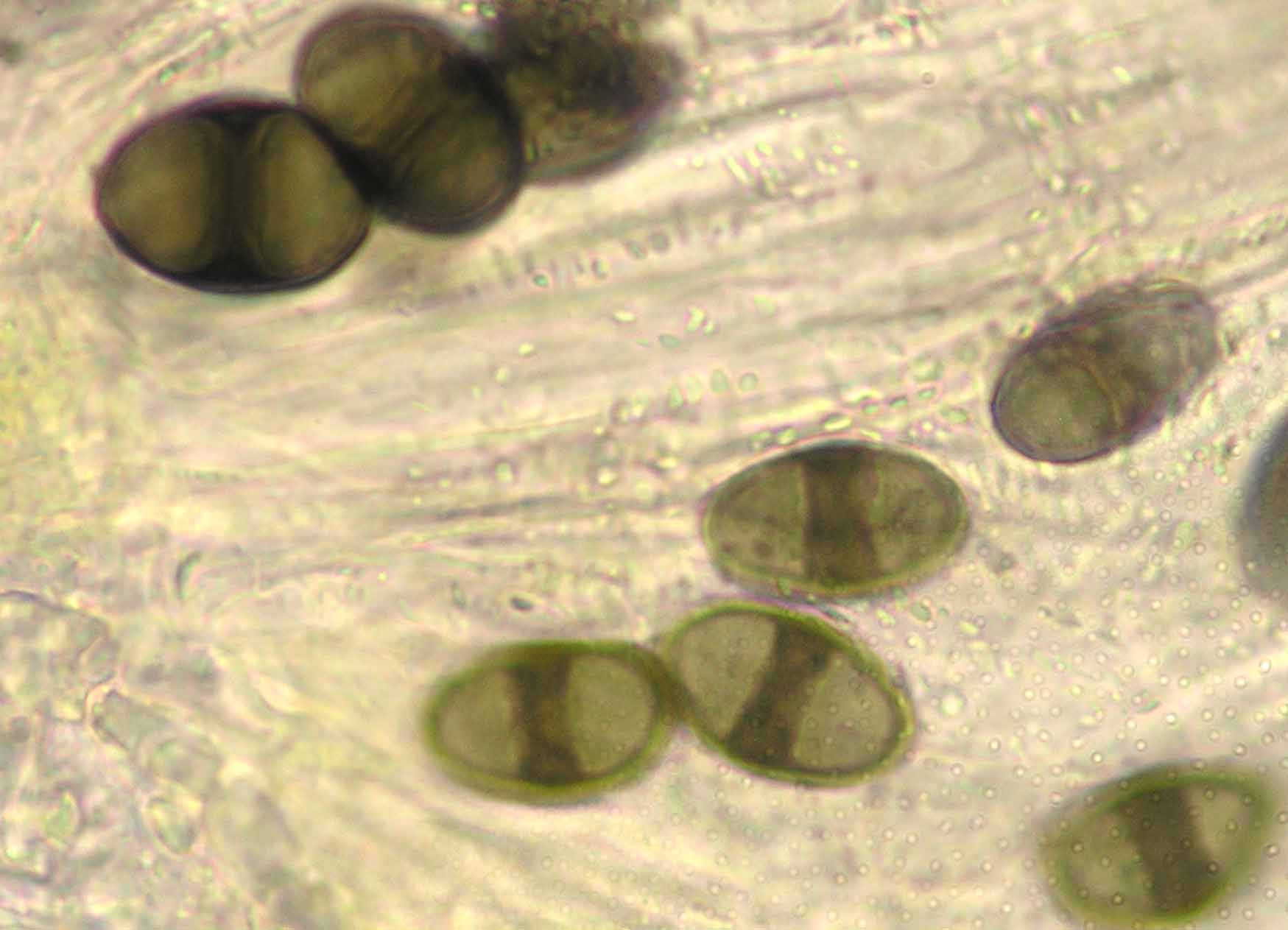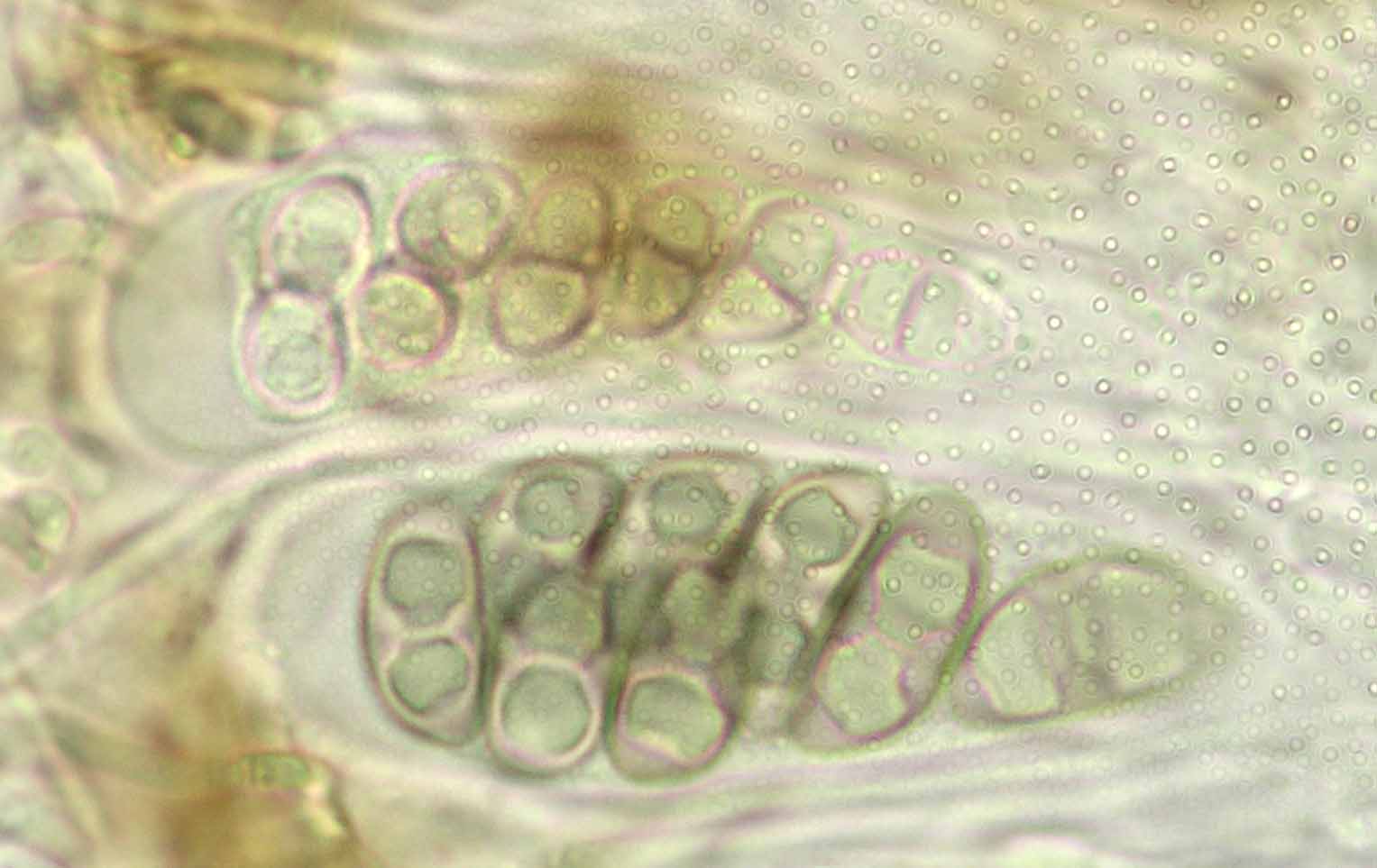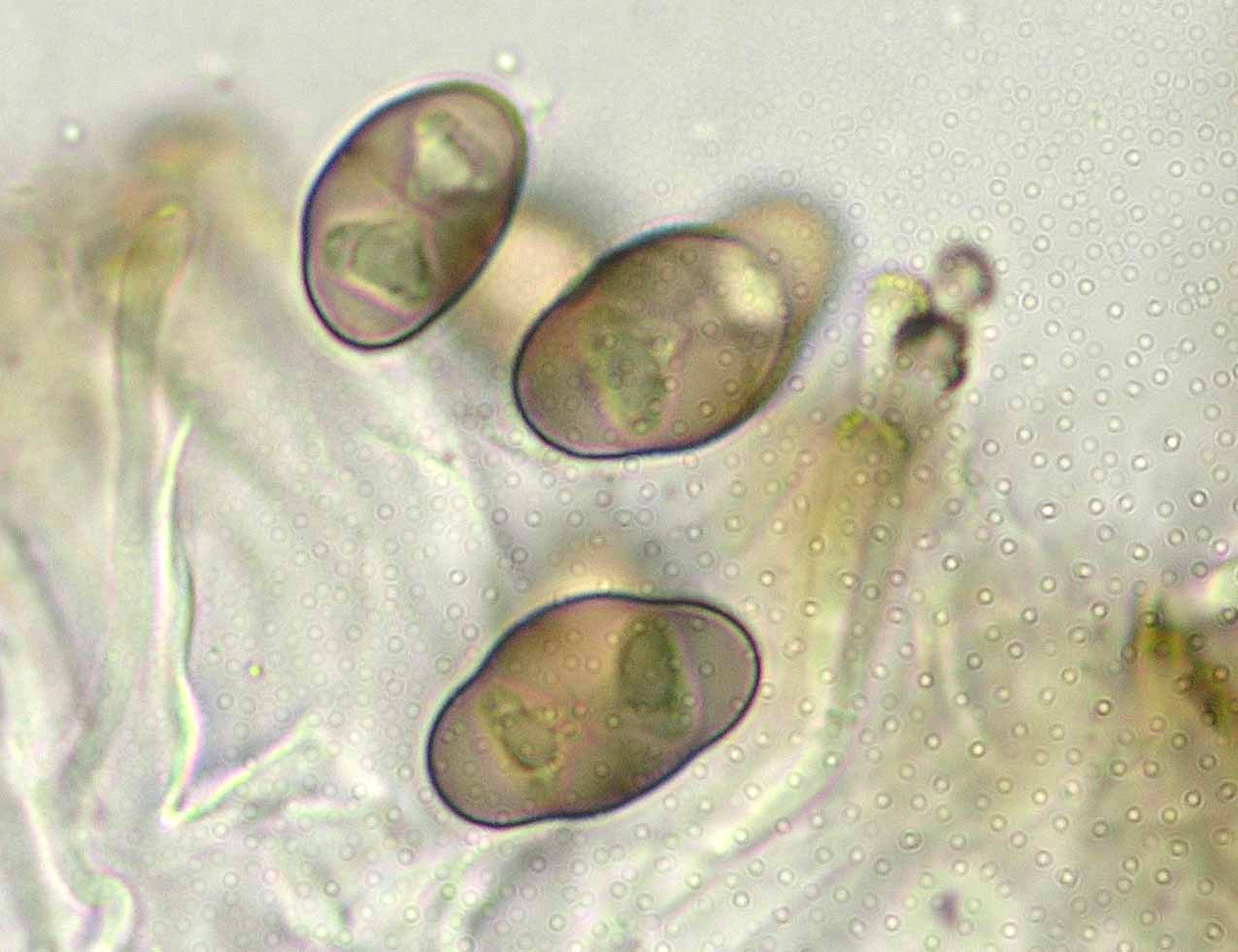 (Sipman 54255pp) spores in KOH (note epithecium staining); picture length = 130 mu; click for enlargement. (Sipman 54255pp) spores in KOH (note epithecium staining); picture length = 130 mu; click for enlargement.
