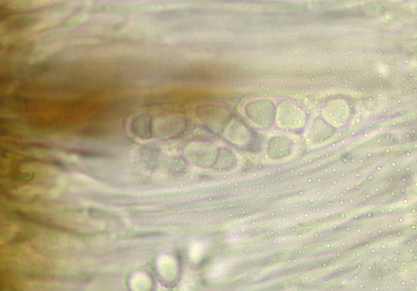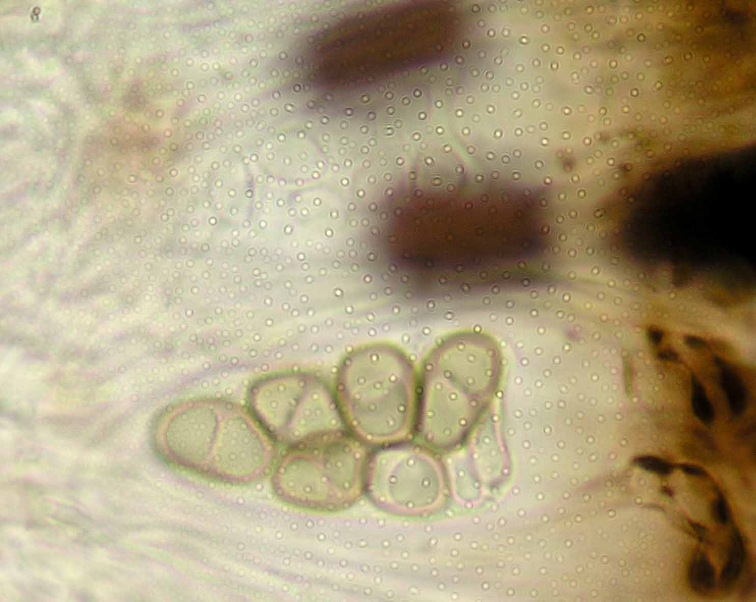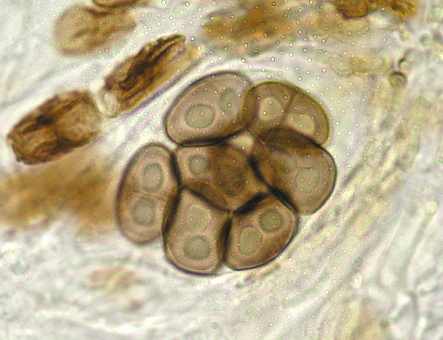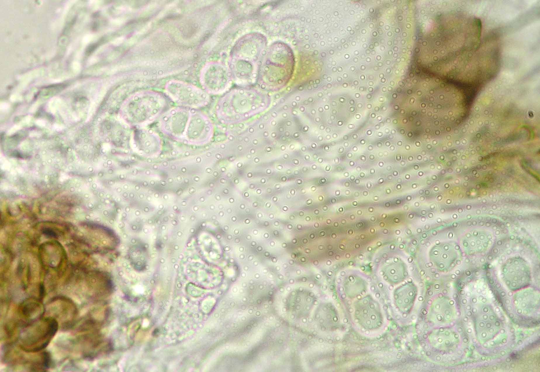 (Sipman 54255pp) spores in KOH (note epithecium staining); picture length = 130 mu; click for enlargement. (Sipman 54255pp) spores in KOH (note epithecium staining); picture length = 130 mu; click for enlargement.
