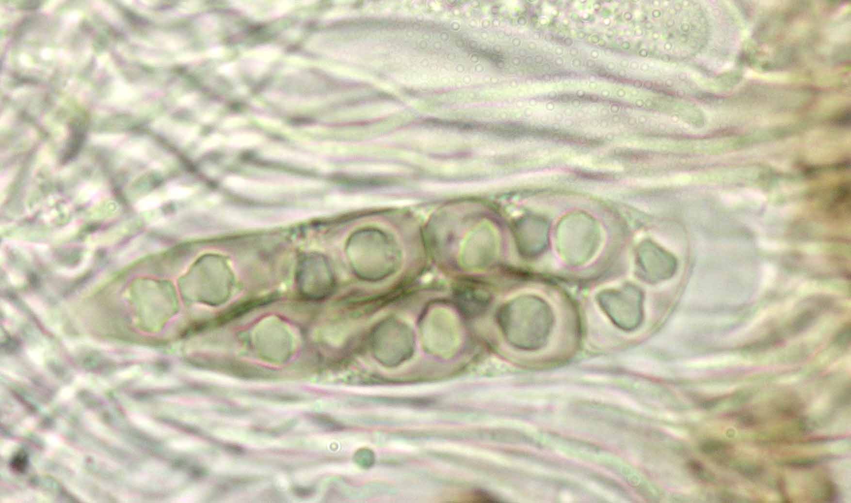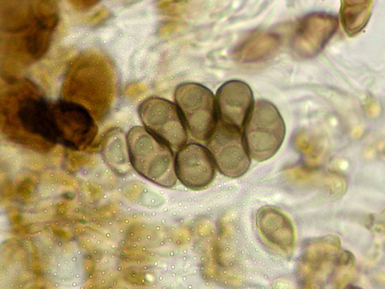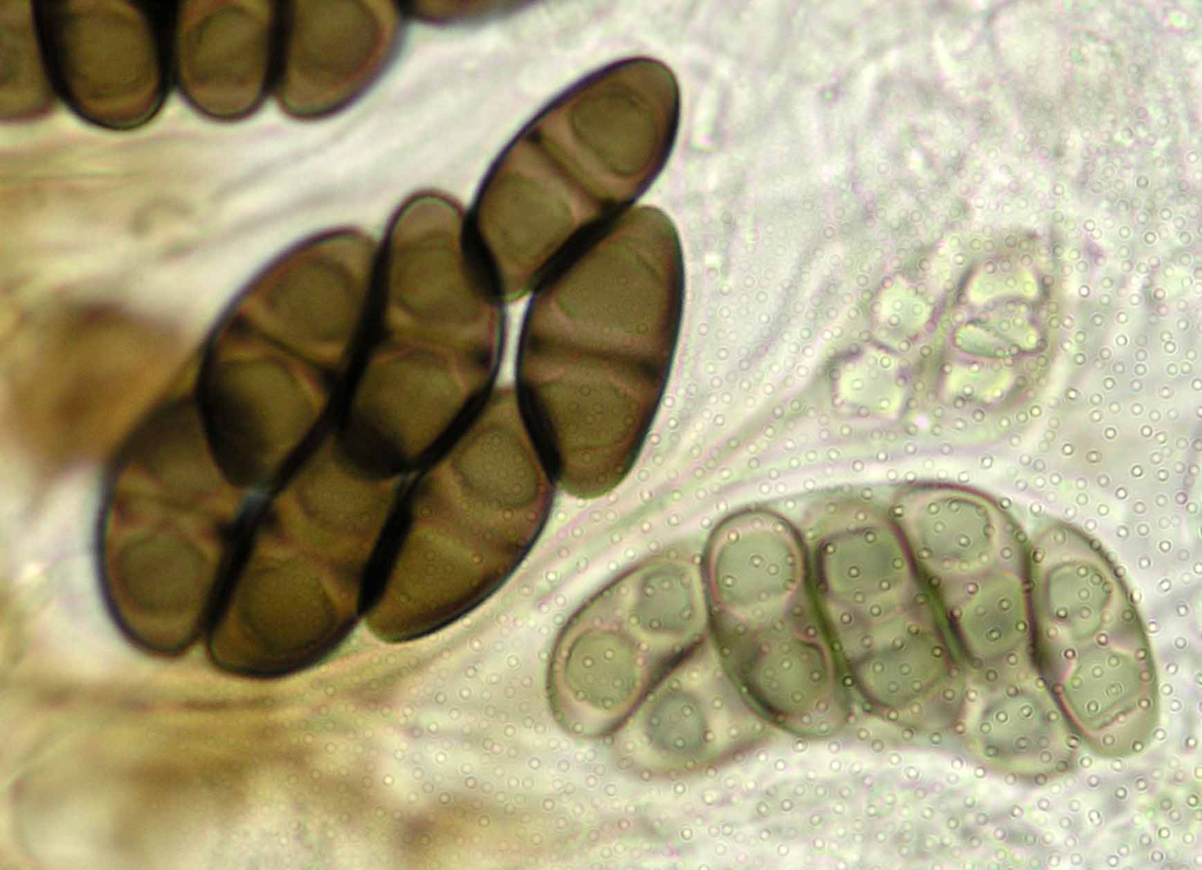 (Sipman 53667) spores in KOH; picture length = 130 mu; click for enlargement. (Sipman 53667) spores in KOH; picture length = 130 mu; click for enlargement.