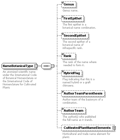 | source | <xs:complexType name="BotanicalGardenUnitType"> <xs:annotation> <xs:documentation>Elements specific to units from botanical gardens</xs:documentation> </xs:annotation> <xs:sequence> <xs:element name="AccessionSpecimenNumbers" type="xs:int" minOccurs="0"> <xs:annotation> <xs:documentation>Minimum numbers of individuals the garden is holding under the UnitID.</xs:documentation> <xs:appinfo> <sea:FullName>Accession specimen numbers</sea:FullName> <sea:Audience>BioCASE</sea:Audience> <sea:Audience>CODATA TDWG</sea:Audience> <sea:Reviewer>Berendsohn</sea:Reviewer> <sea:ExistingStandards>HISPID 3: n/a. </sea:ExistingStandards> <sea:ExistingStandards>ITF 2: AccessionSpecimenNumbers (=accspe). </sea:ExistingStandards> <sea:Content> </sea:Content> <sea:Examples>1</sea:Examples> <sea:Comments>Field definition taken from ITF 2.</sea:Comments> <sea:Rules>Accession status must not be D (dead)</sea:Rules> <sea:EditorialNotes> </sea:EditorialNotes> </xs:appinfo> </xs:annotation> </xs:element> <xs:element name="AccessionStatus" type="xs:byte" minOccurs="0"> <xs:annotation> <xs:documentation>Current status (current or not current) of the accession in the garden.</xs:documentation> <xs:appinfo> <sea:FullName>Accession status</sea:FullName> <sea:Audience>BioCASE</sea:Audience> <sea:Audience>CODATA TDWG</sea:Audience> <sea:Reviewer>Berendsohn</sea:Reviewer> <sea:ExistingStandards>HISPID 3: n/a. </sea:ExistingStandards> <sea:ExistingStandards>ITF 2: AccessionStatus (=accsta). </sea:ExistingStandards> <sea:Content>The status may be C (current accession in the living collection), D (non-current due to death), T (non current due to transfer to another record system, normally another garden), S (stored in a dormant state), O (other accession status - different from those above). </sea:Content> <sea:Examples>C</sea:Examples> <sea:Comments>Field definition taken from ITF 2.</sea:Comments> <sea:Rules>One or more of the following characters: C,D,T,S,O</sea:Rules> <sea:EditorialNotes> </sea:EditorialNotes> </xs:appinfo> </xs:annotation> </xs:element> <xs:element name="AccessionMaterialType" type="xs:string" minOccurs="0"> <xs:annotation> <xs:documentation>Type of material the current living accession is composed of.</xs:documentation> <xs:appinfo> <sea:FullName>Accession material type</sea:FullName> <sea:Audience>BioCASE</sea:Audience> <sea:Audience>CODATA TDWG</sea:Audience> <sea:Reviewer>Berendsohn</sea:Reviewer> <sea:ExistingStandards>HISPID 3: n/a. </sea:ExistingStandards> <sea:ExistingStandards>ITF 2: AccessionStatus (=accsta). </sea:ExistingStandards> <sea:Content>The status may be C (current accession in the living collection), D (non-current due to death), T (non current due to transfer to another record system, normally another garden), S (stored in a dormant state), O (other accession status - different from those above). </sea:Content> <sea:Examples>C</sea:Examples> <sea:Comments>Field definition taken from ITF 2.</sea:Comments> <sea:Rules>One or more of the following characters: C,D,T,S,O</sea:Rules> <sea:EditorialNotes> </sea:EditorialNotes> </xs:appinfo> </xs:annotation> </xs:element> <xs:element name="Hardiness" type="xs:boolean" minOccurs="0"> <xs:annotation> <xs:documentation>A flag indicating that the accession is grown outdoors in the botanical garden.</xs:documentation> <xs:appinfo> <sea:FullName>Hardiness</sea:FullName> <sea:Audience>BioCASE</sea:Audience> <sea:Audience>CODATA TDWG</sea:Audience> <sea:Reviewer>Berendsohn</sea:Reviewer> <sea:ExistingStandards>HISPID 3: n/a. </sea:ExistingStandards> <sea:ExistingStandards>ITF 2: -. </sea:ExistingStandards> <sea:Content> </sea:Content> <sea:Examples> </sea:Examples> <sea:Comments> </sea:Comments> <sea:Rules> </sea:Rules> <sea:EditorialNotes> </sea:EditorialNotes> </xs:appinfo> </xs:annotation> </xs:element> <xs:element name="ProvenanceCategory" type="xs:byte" minOccurs="0"> <xs:annotation> <xs:documentation> </xs:documentation> <xs:appinfo> <sea:FullName>Provenance category</sea:FullName> <sea:Audience>BioCASE</sea:Audience> <sea:Audience>CODATA TDWG</sea:Audience> <sea:Reviewer>Berendsohn</sea:Reviewer> <sea:ExistingStandards>HISPID 3:- </sea:ExistingStandards> <sea:ExistingStandards>ITF 2: Provenance Type Flag (=prot). </sea:ExistingStandards> <sea:Content>W (Accession of wild source), Z (Propagule/s from a wild source plant in cultivation, G (Accession not of wild source), U (Insufficient data to determine which category applies).</sea:Content> <sea:Examples>Z</sea:Examples> <sea:Comments>Field definition taken from ITF 2, see there for further description.</sea:Comments> <sea:Rules>See ITF.</sea:Rules> <sea:EditorialNotes> </sea:EditorialNotes> </xs:appinfo> </xs:annotation> </xs:element> <xs:element name="PropagationHistoryCode" type="xs:string" minOccurs="0"> <xs:annotation> <xs:documentation>A code to indicate the nature of the production of the plant material being accessioned, for you in association with the element ProvenanceType</xs:documentation> <xs:appinfo> <sea:FullName>Propagation history code</sea:FullName> <sea:Audience>BioCASE</sea:Audience> <sea:Audience>CODATA TDWG</sea:Audience> <sea:Reviewer>Berendsohn</sea:Reviewer> <sea:ExistingStandards>HISPID 3:- </sea:ExistingStandards> <sea:ExistingStandards>ITF 2: Propagation History Flag (=prohis). </sea:ExistingStandards> <sea:Content>See ITF 2.</sea:Content> <sea:Examples> </sea:Examples> <sea:Comments>Field definition taken from ITF 2.</sea:Comments> <sea:Rules>One of the following values: I, S, SA, SB, SC, V, VA, VB, U</sea:Rules> <sea:EditorialNotes> </sea:EditorialNotes> </xs:appinfo> </xs:annotation> </xs:element> <xs:element name="AccessionLineage" type="xs:string" minOccurs="0"> <xs:annotation> <xs:documentation>The purpose of this element is to trace the lineage of an accession to either one or two immediate parent unit ID's. </xs:documentation> <xs:appinfo> <sea:FullName>Accession lineage</sea:FullName> <sea:Audience>BioCASE</sea:Audience> <sea:Audience>CODATA TDW