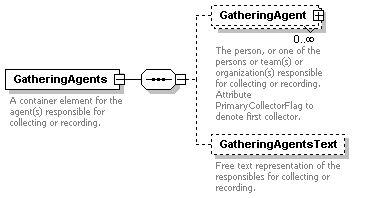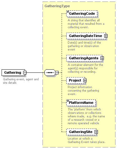 | source | <xs:element name="Gathering" minOccurs="0"> <xs:annotation> <xs:documentation>Gathering event, agent and site details</xs:documentation> </xs:annotation> <xs:complexType> <xs:complexContent> <xs:extension base="GatheringType"/> </xs:complexContent> </xs:complexType> </xs:element> |