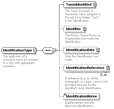 | source | <xs:complexType name="BotanicalGardenUnitType"> <xs:annotation> <xs:documentation>Elements specific to units from botanical gardens</xs:documentation> </xs:annotation> <xs:sequence> <xs:element name="AccessionSpecimenNumbers" type="xs:int" minOccurs="0"> <xs:annotation> <xs:documentation>Minimum numbers of individuals the garden is holding under the UnitID.</xs:documentation> <xs:appinfo> <sea:FullName>Accession specimen numbers</sea:FullName> <sea:Audience>BioCASE</sea:Audience> <sea:Audience>CODATA TDWG</sea:Audience> <sea:Reviewer>Berendsohn</sea:Reviewer> <sea:ExistingStandards>HISPID 3: n/a. </sea:ExistingStandards> <sea:ExistingStandards>ITF 2: AccessionSpecimenNumbers (=accspe). </sea:ExistingStandards> <sea:Content> </sea:Content> <sea:Examples>1</sea:Examples> <sea:Comments>Field definition taken from ITF 2.</sea:Comments> <sea:Rules>Accession status must not be D (dead)</sea:Rules> <sea:EditorialNotes> </sea:EditorialNotes> </xs:appinfo> </xs:annotation> </xs:element> <xs:element name="AccessionStatus" type="xs:byte" minOccurs="0"> <xs:annotation> <xs:documentation>Current status (current or not current) of the accession in the garden.</xs:documentation> <xs:appinfo> <sea:FullName>Accession status</sea:FullName> <sea:Audience>BioCASE</sea:Audience> <sea:Audience>CODATA TDWG</sea:Audience> <sea:Reviewer>Berendsohn</sea:Reviewer> <sea:ExistingStandards>HISPID 3: n/a. </sea:ExistingStandards> <sea:ExistingStandards>ITF 2: AccessionStatus (=accsta). </sea:ExistingStandards> <sea:Content>The status may be C (current accession in the living collection), D (non-current due to death), T (non current due to transfer to another record system, normally another garden), S (stored in a dormant state), O (other accession status - different from those above). </sea:Content> <sea:Examples>C</sea:Examples> <sea:Comments>Field definition taken from ITF 2.</sea:Comments> <sea:Rules>One or more of the following characters: C,D,T,S,O</sea:Rules> <sea:EditorialNotes> </sea:EditorialNotes> </xs:appinfo> </xs:annotation> </xs:element> <xs:element name="AccessionMaterialType" type="xs:string" minOccurs="0"> <xs:annotation> <xs:documentation>Type of material the current living accession is composed of.</xs:documentation> <xs:appinfo> <sea:FullName>Accession material type</sea:FullName> <sea:Audience>BioCASE</sea:Audience> <sea:Audience>CODATA TDWG</sea:Audience> <sea:Reviewer>Berendsohn</sea:Reviewer> <sea:ExistingStandards>HISPID 3: n/a. </sea:ExistingStandards> <sea:ExistingStandards>ITF 2: AccessionStatus (=accsta). </sea:ExistingStandards> <sea:Content>The status may be C (current accession in the living collection), D (non-current due to death), T (non current due to transfer to another record system, normally another garden), S (stored in a dormant state), O (other accession status - different from those above). </sea:Content> <sea:Examples>C</sea:Examples> <sea:Comments>Field definition taken from ITF 2.</sea:Comments> <sea:Rules>One or more of the following characters: C,D,T,S,O</sea:Rules> <sea:EditorialNotes> </sea:EditorialNotes> </xs:appinfo> </xs:annotation> </xs:element> <xs:element name="Hardiness" type="xs:boolean" minOccurs="0"> <xs:annotation> <xs:documentation>A flag indicating that the accession is grown outdoors in the botanical garden.</xs:documentation> <xs:appinfo> <sea:FullName>Hardiness</sea:FullName> <sea:Audience>BioCASE</sea:Audience> <sea:Audience>CODATA TDWG</sea:Audience> <sea:Reviewer>Berendsohn</sea:Reviewer> <sea:ExistingStandards>HISPID 3: n/a. </sea:ExistingStandards> <sea:ExistingStandards>ITF 2: -. </sea:ExistingStandards> <sea:Content> </sea:Content> <sea:Examples> </sea:Examples> <sea:Comments> </sea:Comments> <sea:Rules> </sea:Rules> <sea:EditorialNotes> </sea:EditorialNotes> </xs:appinfo> </xs:annotation> </xs:element> <xs:element name="ProvenanceCategory" type="xs:byte" minOccurs="0"> <xs:annotation> <xs:documentation> </xs:documentation> <xs:appinfo> <sea:FullName>Provenance category</sea:FullName> <sea:Audience>BioCASE</sea:Audience> <sea:Audience>CODATA TDWG</sea:Audience> <sea:Reviewer>Berendsohn</sea:Reviewer> <sea:ExistingStandards>HISPID 3:- </sea:ExistingStandards> <sea:ExistingStandards>ITF 2: Provenance Type Flag (=prot). </sea:ExistingStandards> <sea:Content>W (Accession of wild source), Z (Propagule/s from a wild source plant in cultivation, G (Accession not of wild source), U (Insufficient data to determine which category applies).</sea:Content> <sea:Examples>Z</sea:Examples> <sea:Comments>Field definition taken from ITF 2, see there for further description.</sea:Comments> <sea:Rules>See ITF.</sea:Rules> <sea:EditorialNotes> </sea:EditorialNotes> </xs:appinfo> </xs:annotation> </xs:element> <xs:element name="PropagationHistoryCode" type="xs:string" minOccurs="0"> <xs:annotation> <xs:documentation>A code to indicate the nature of the production of the plant material being accessioned, for you in association with the element ProvenanceType</xs:documentation> <xs:appinfo> <sea:FullName>Propagation history code</sea:FullName> <sea:Audience>BioCASE</sea:Audience> <sea:Audience>CODATA TDWG</sea:Audience> <sea:Reviewer>Berendsohn</sea:Reviewer> <sea:ExistingStandards>HISPID 3:- </sea:ExistingStandards> <sea:ExistingStandards>ITF 2: Propagation History Flag (=prohis). </sea:ExistingStandards> <sea:Content>See ITF 2.</sea:Content> <sea:Examples> </sea:Examples> <sea:Comments>Field definition taken from ITF 2.</sea:Comments> <sea:Rules>One of the following values: I, S, SA, SB, SC, V, VA, VB, U</sea:Rules> <sea:EditorialNotes> </sea:EditorialNotes> </xs:appinfo> </xs:annotation> </xs:element> <xs:element name="AccessionLineage" type="xs:string" minOccurs="0"> <xs:annotation> <xs:documentation>The purpose of this element is to trace the lineage of an accession to either one or two immediate parent unit ID's. </xs:documentation> <xs:appinfo> <sea:FullName>Accession lineage</sea:FullName> <sea:Audience>BioCASE</sea:Audience> <sea:Audience>CODATA TDW